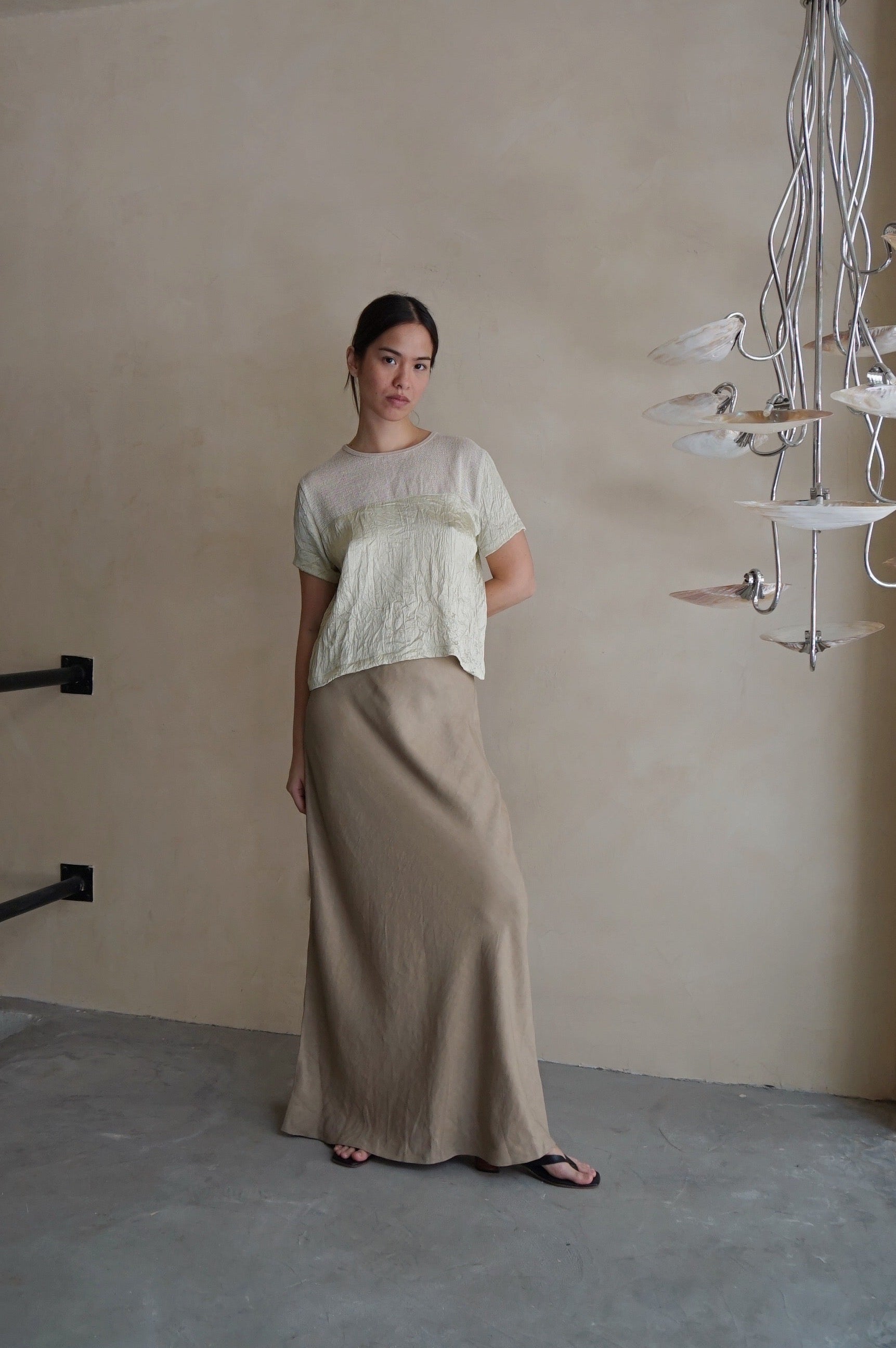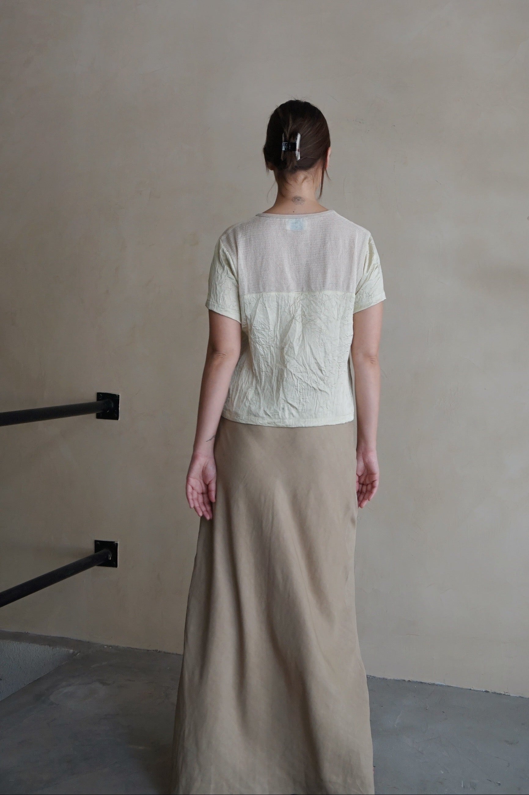 This T-shirt has a round neckline with cotton mesh accents on the chest and back. Body and sleeve are made from Viscose Linen.