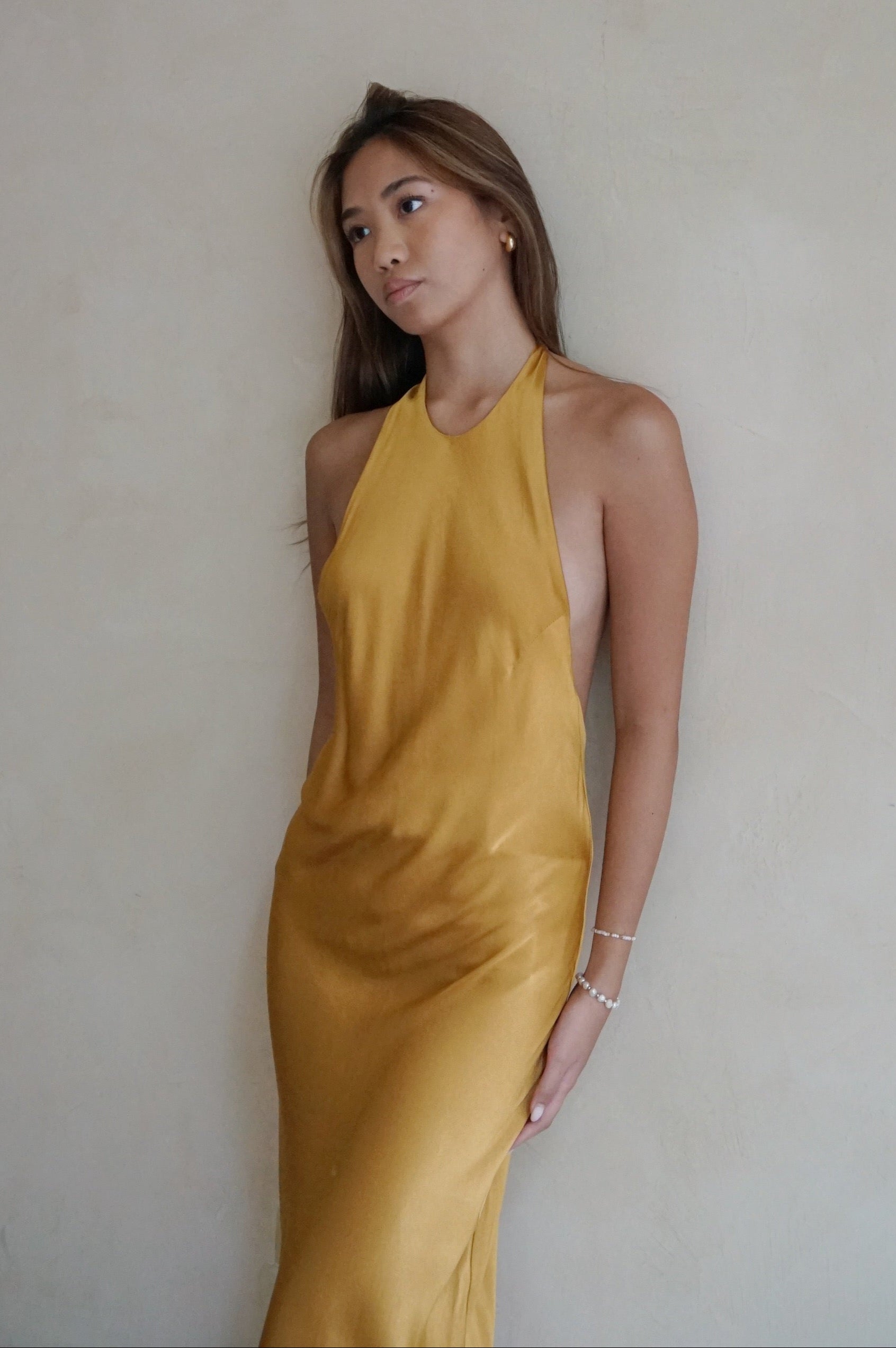 Elegant high neck halter dress with ultra low back. Made from Viscose Satin.