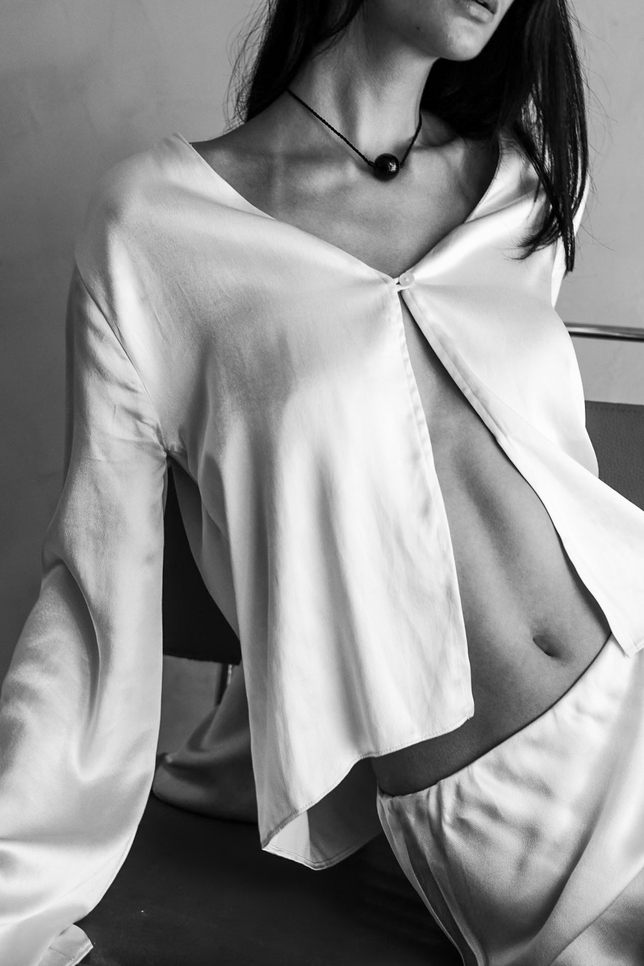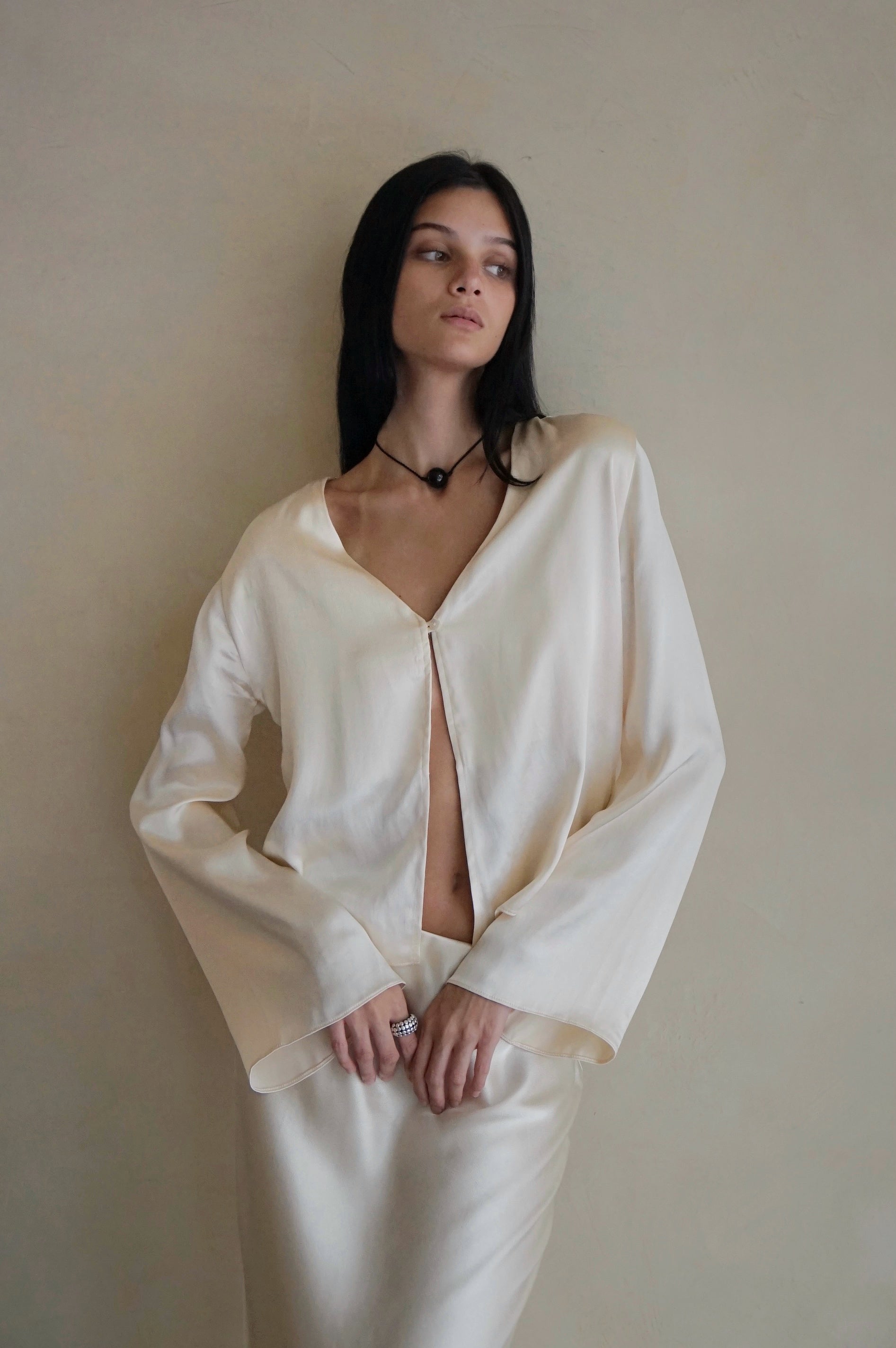 This Bell Longsleeve Top in Champagne features a chic, minimal design with a drapey viscose satin fabric. The bell sleeves and single button detail add subtle elegance, making it perfect for a refined yet effortless look.