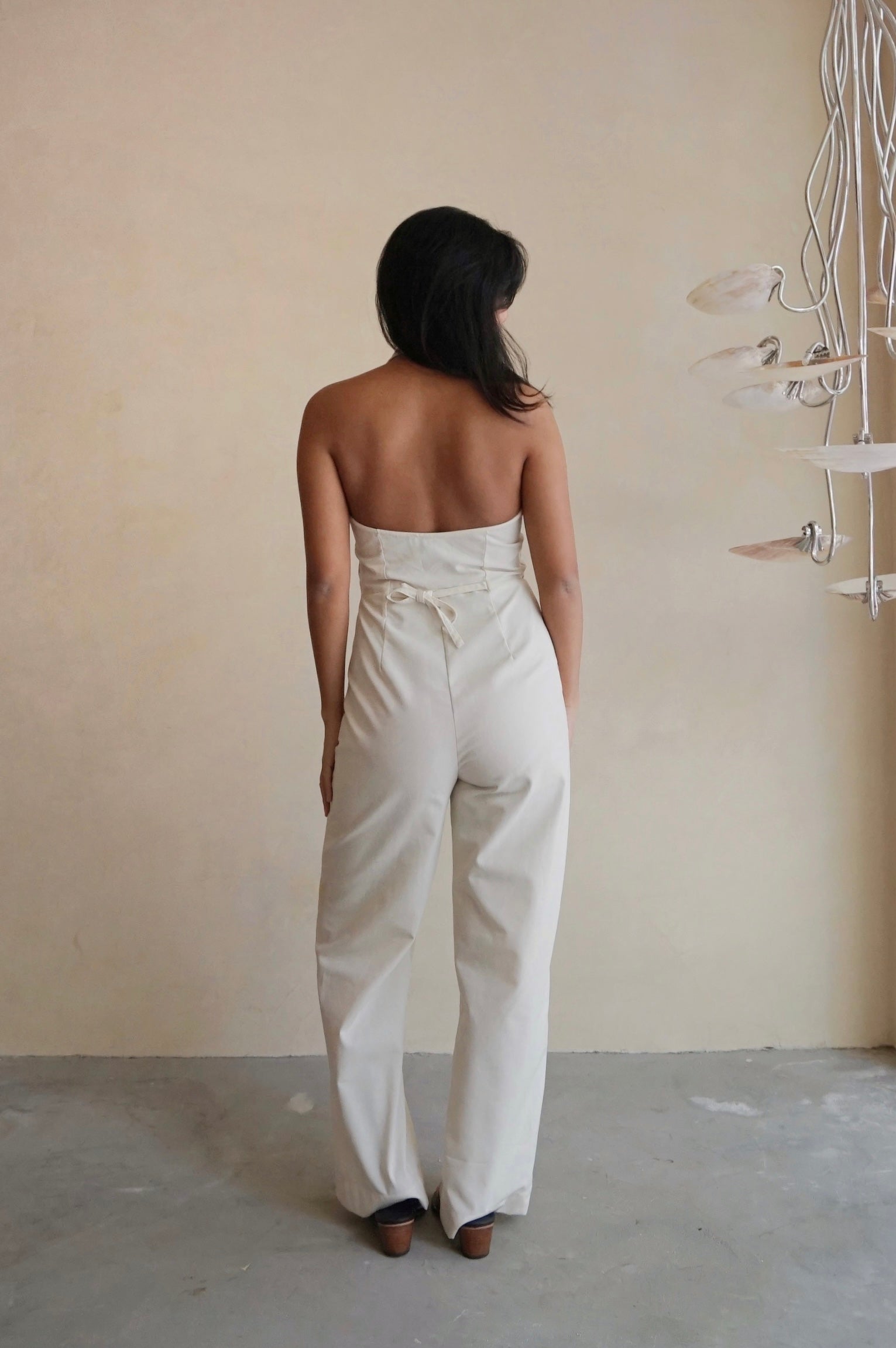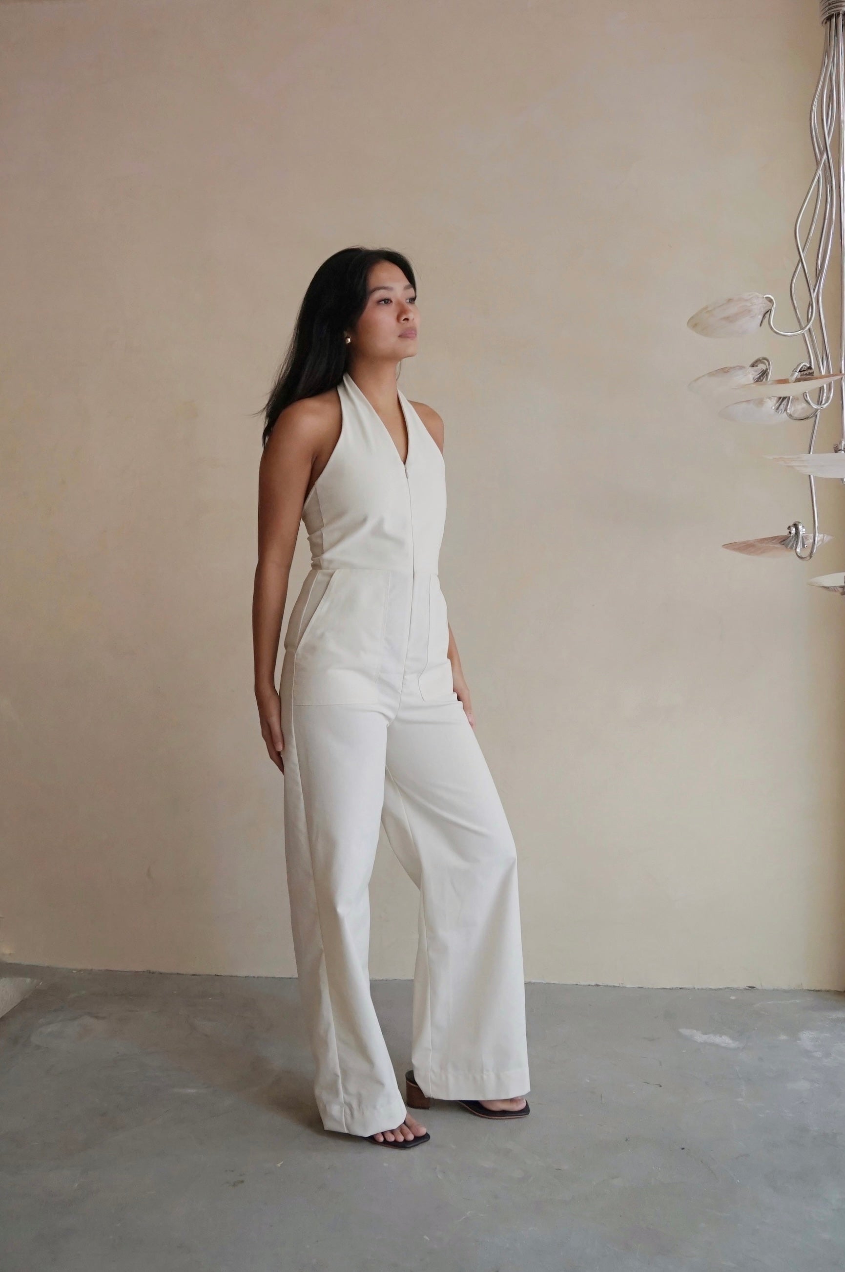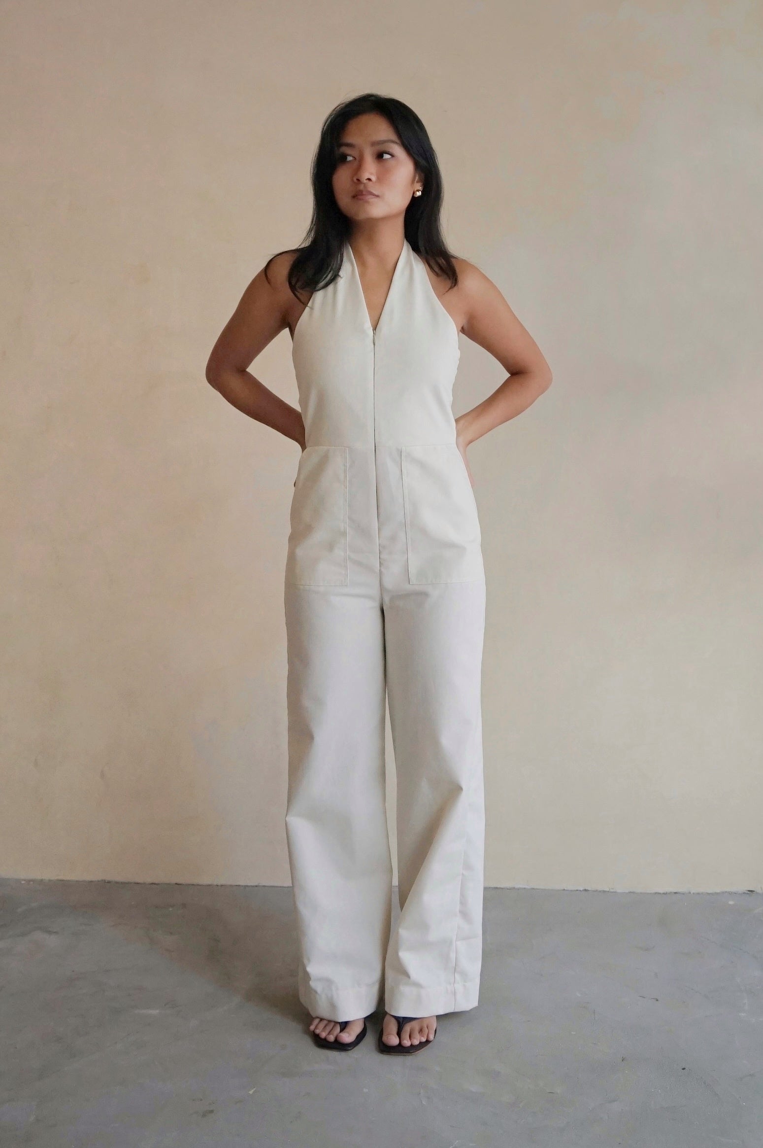 Our most flattering wide leg halter neck jumpsuit. Features full zip front opening, front patch pockets and a cinch at back. Made from Cotton Linen.