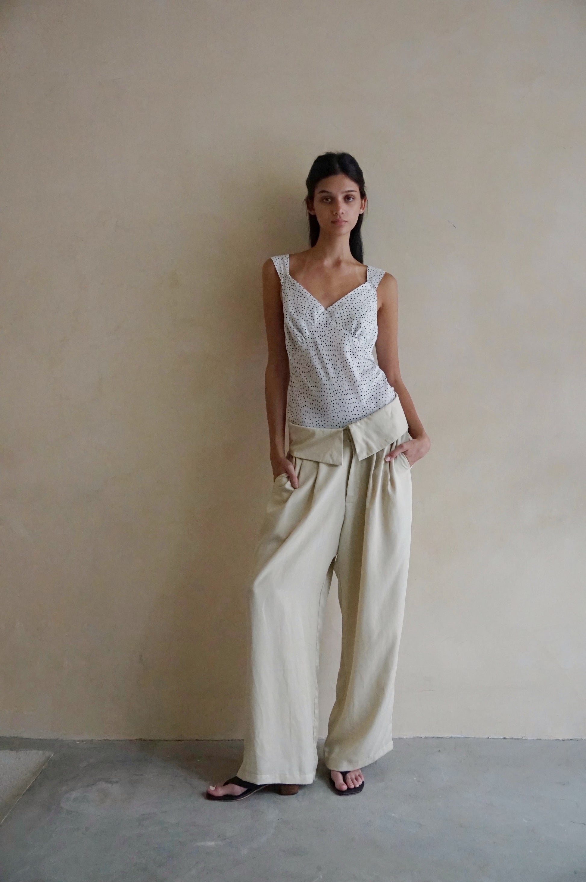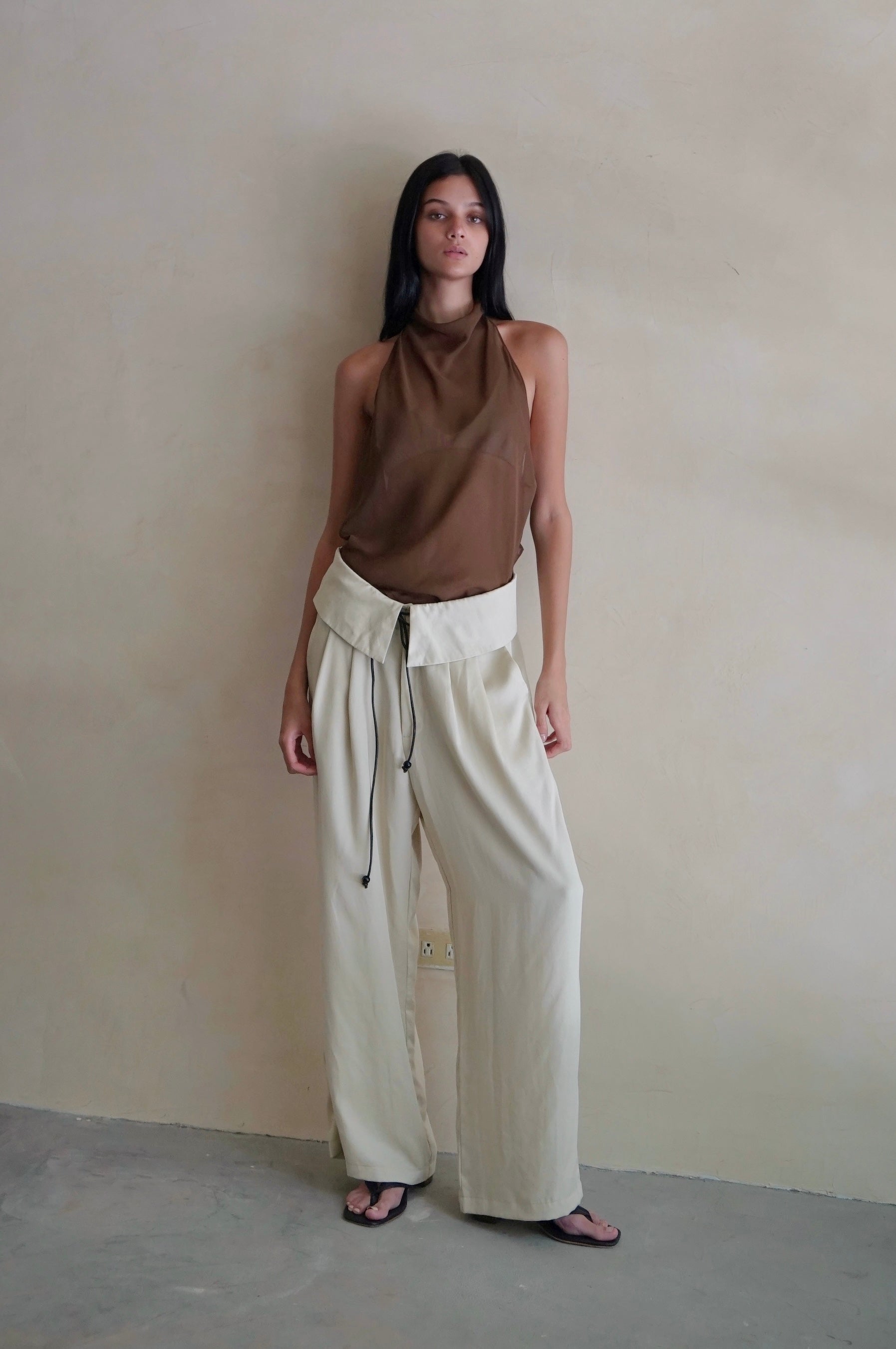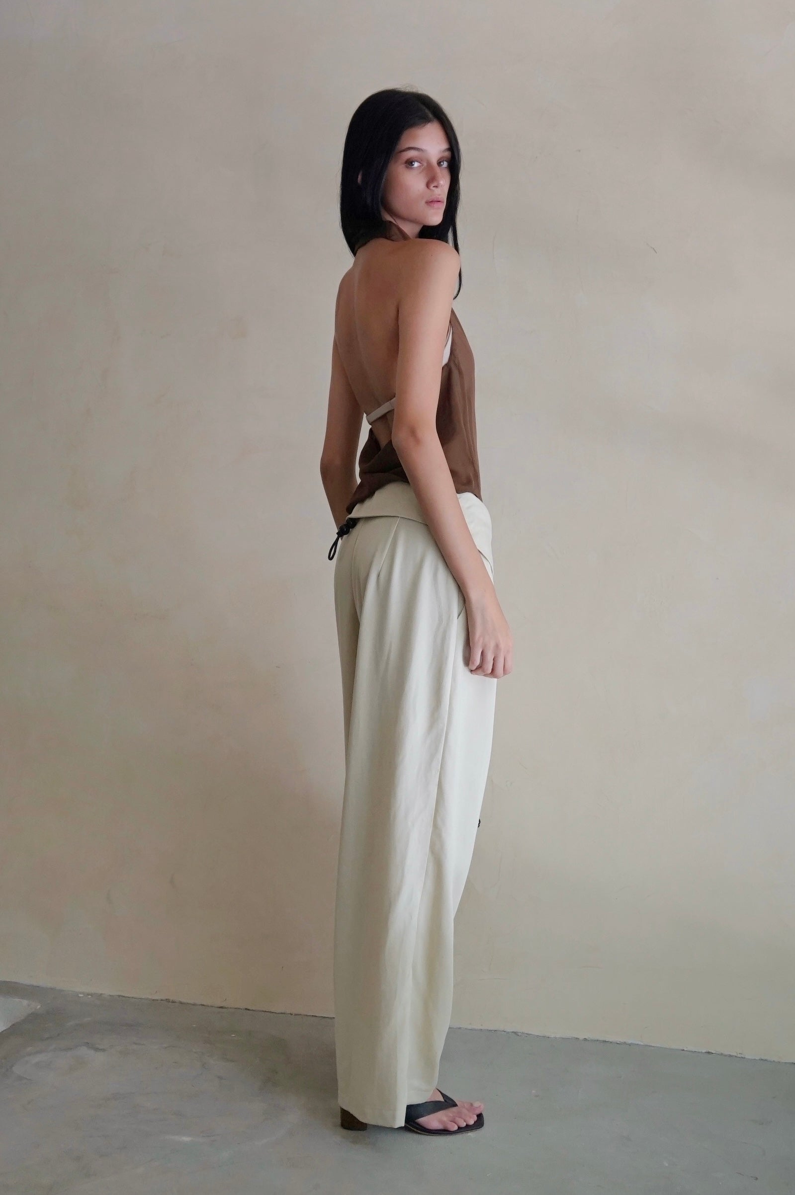 A wide leg trouser featuring double pleats and foldover cuffs made from soft Tencel Twill. Available in Beige and Black