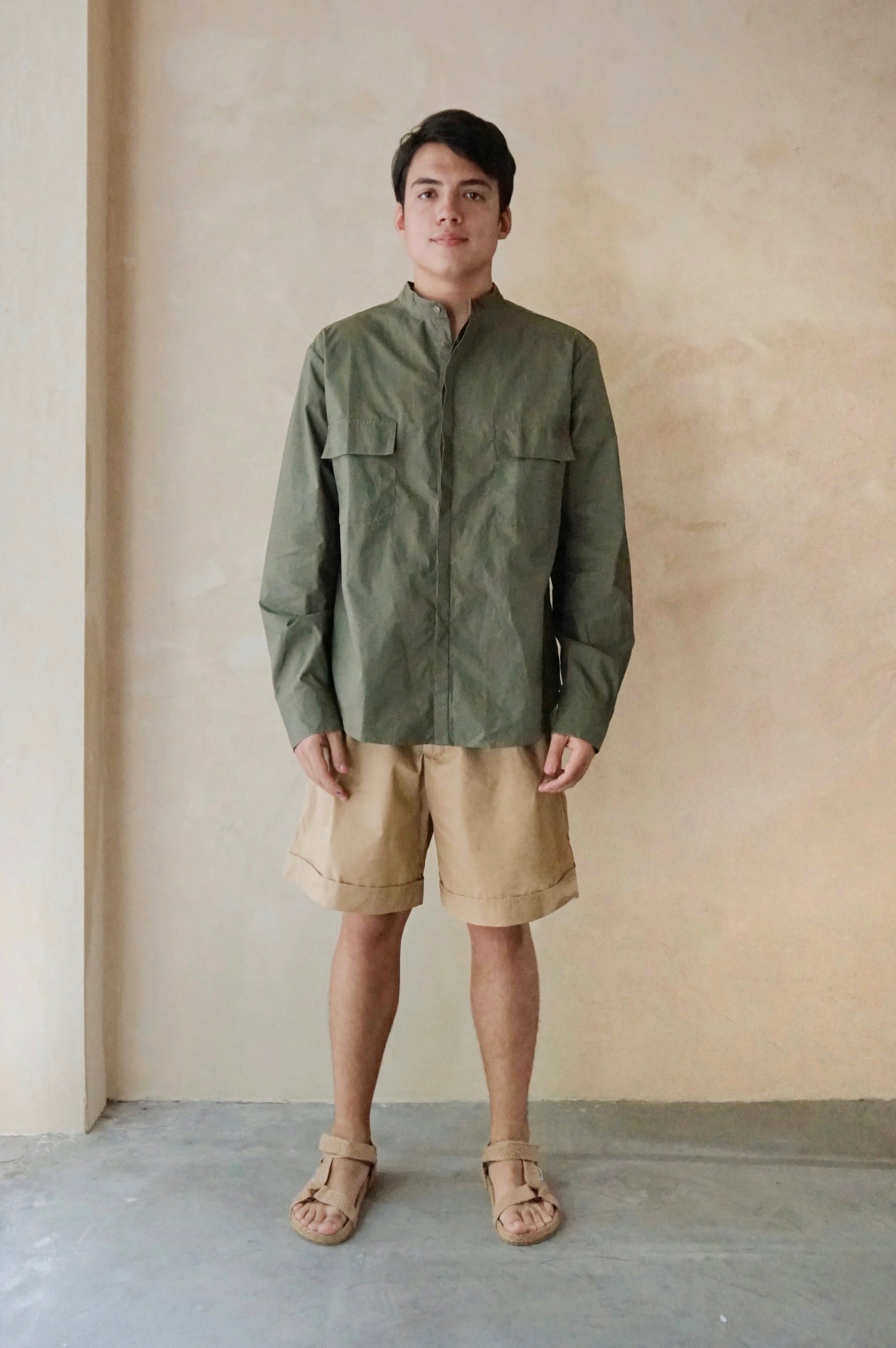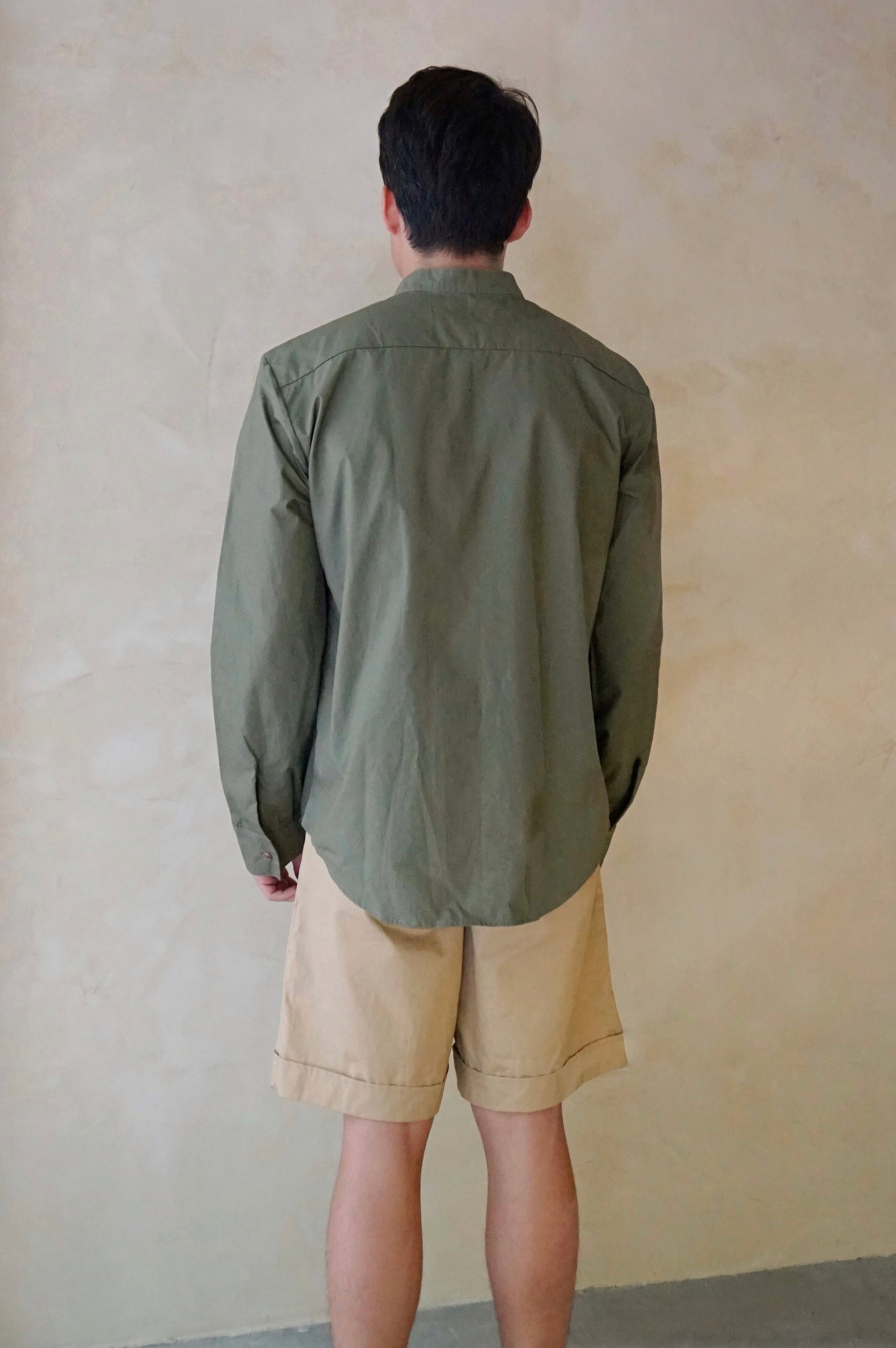 Classic grandad collar long sleeve shirt made from drapey Italian Cotton Satin. Features back darts for a more tailored fit.