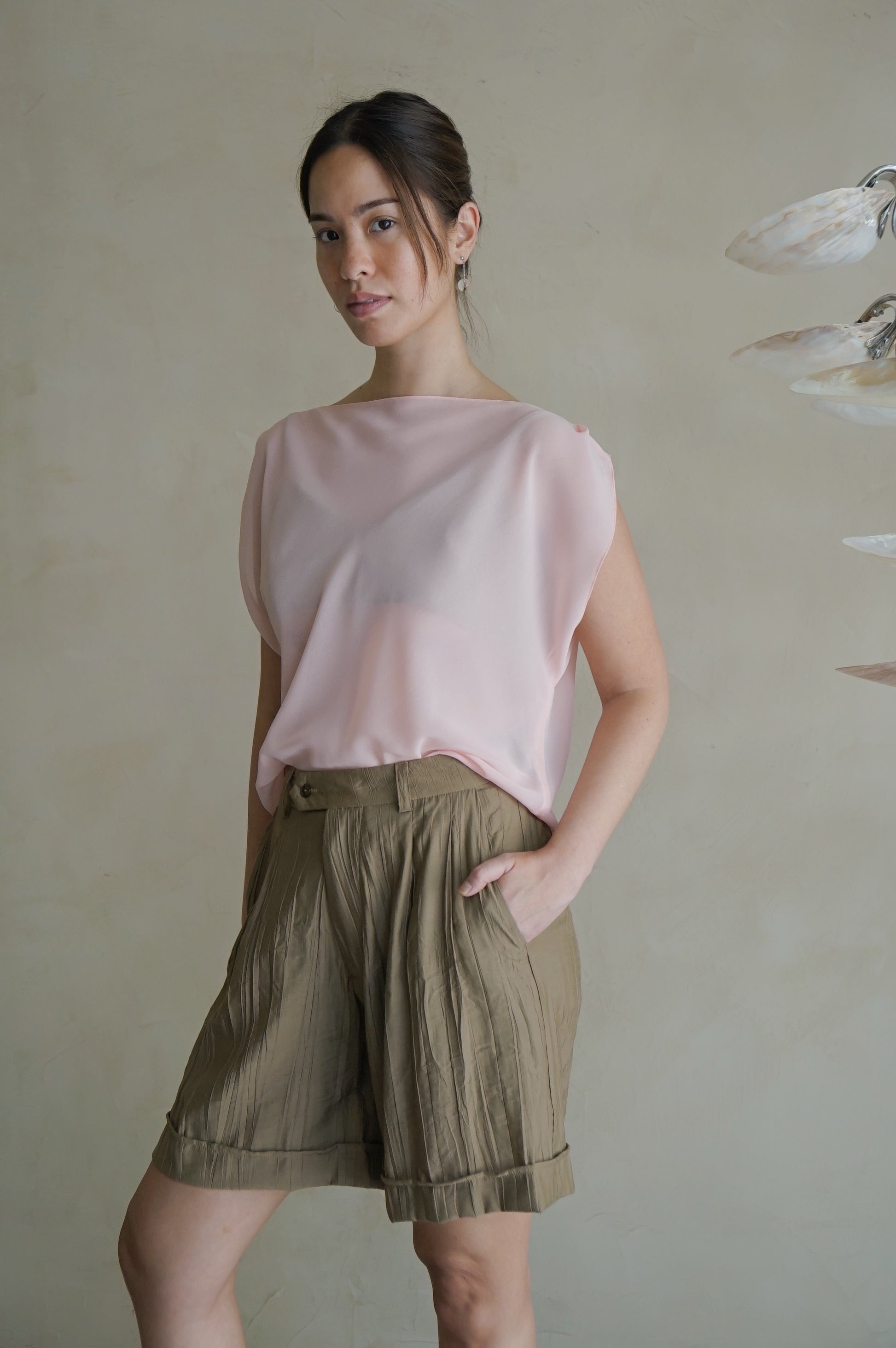 Knee length chino shorts with slight flare made from lightweight Rayon Nylon Crinkle.