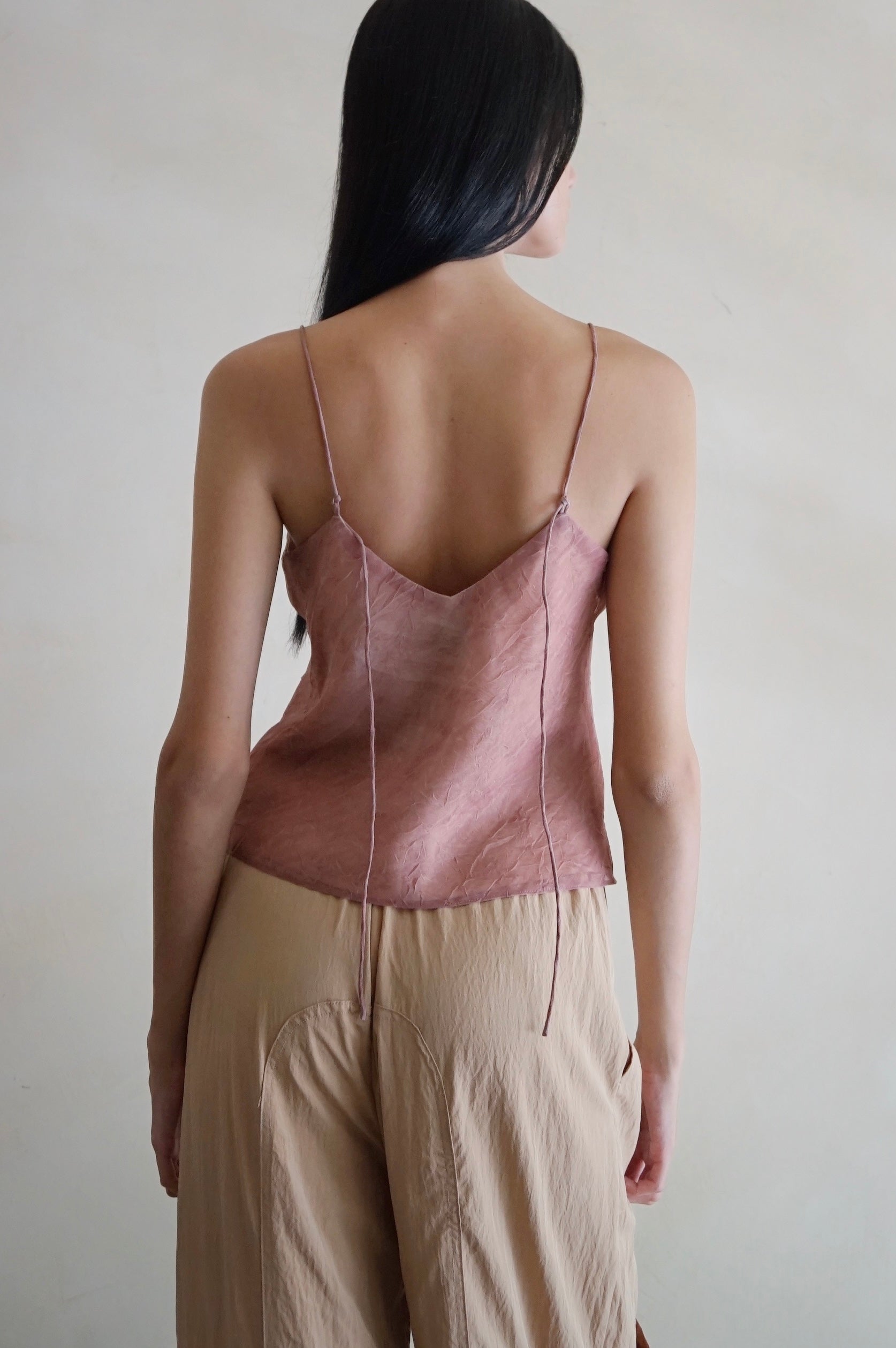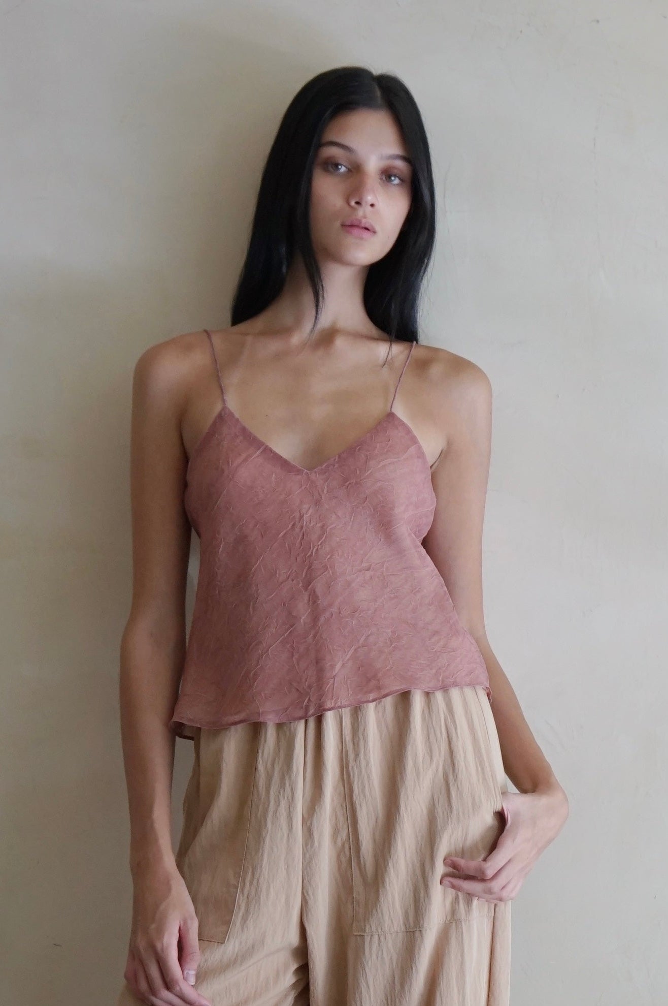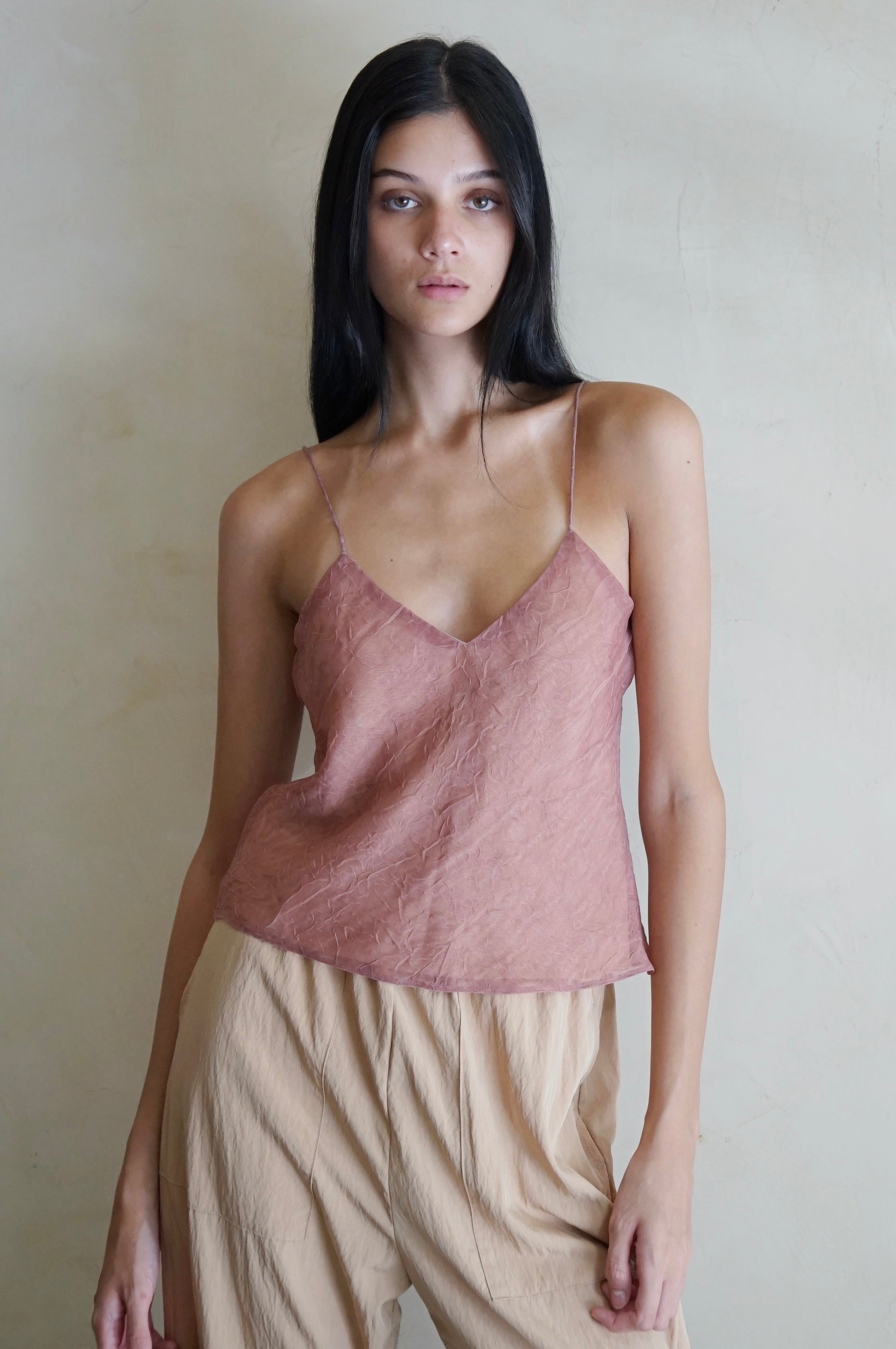 Elegant V neck bias cut slip top featuring rolled adjustable straps. Features soft nude rayon lining underneath sheer Polyester Crinkle.