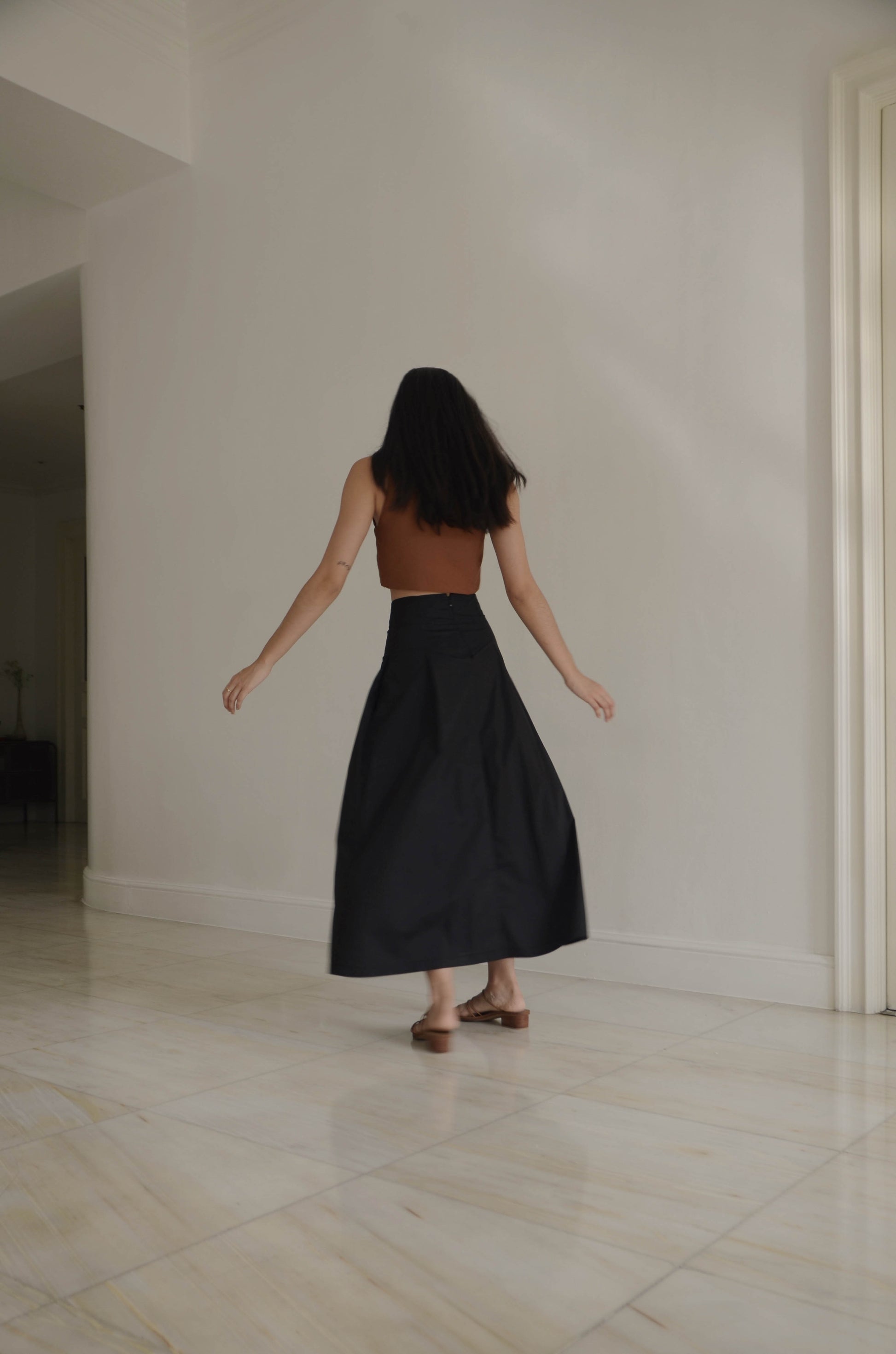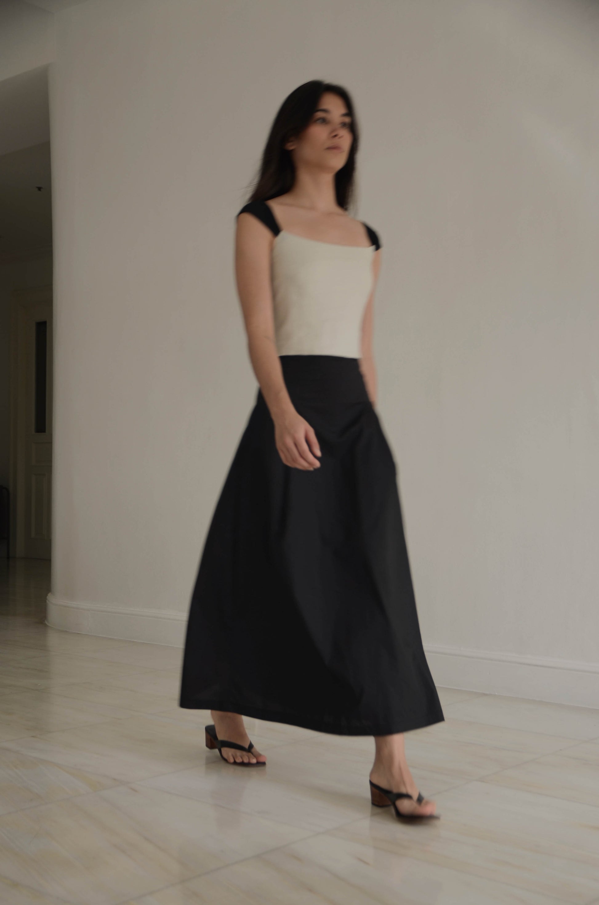 Full length skirt with side slit pockets, full lining, and minimal pleats for added volume. Made from lightweight Italian cotton.