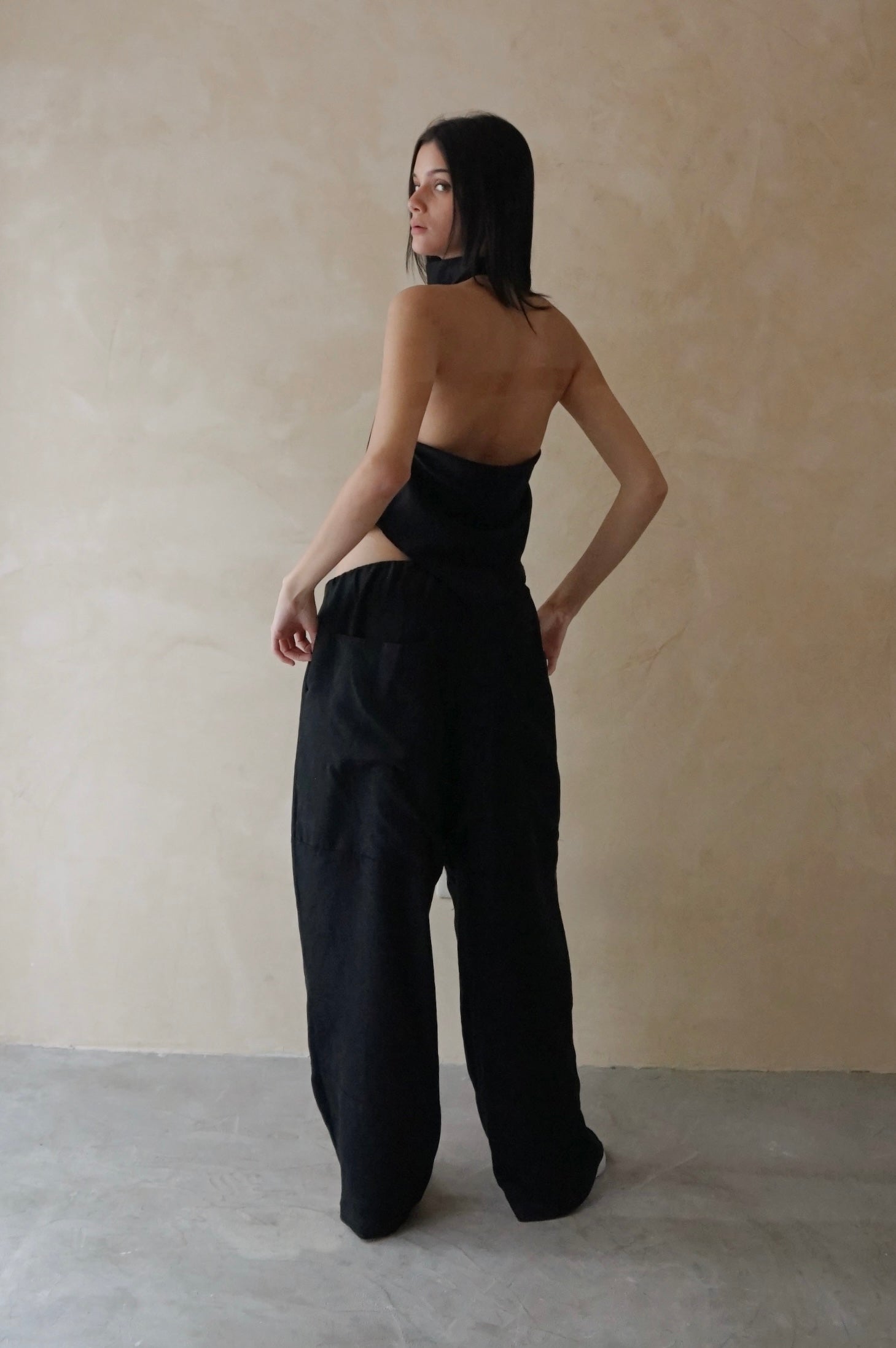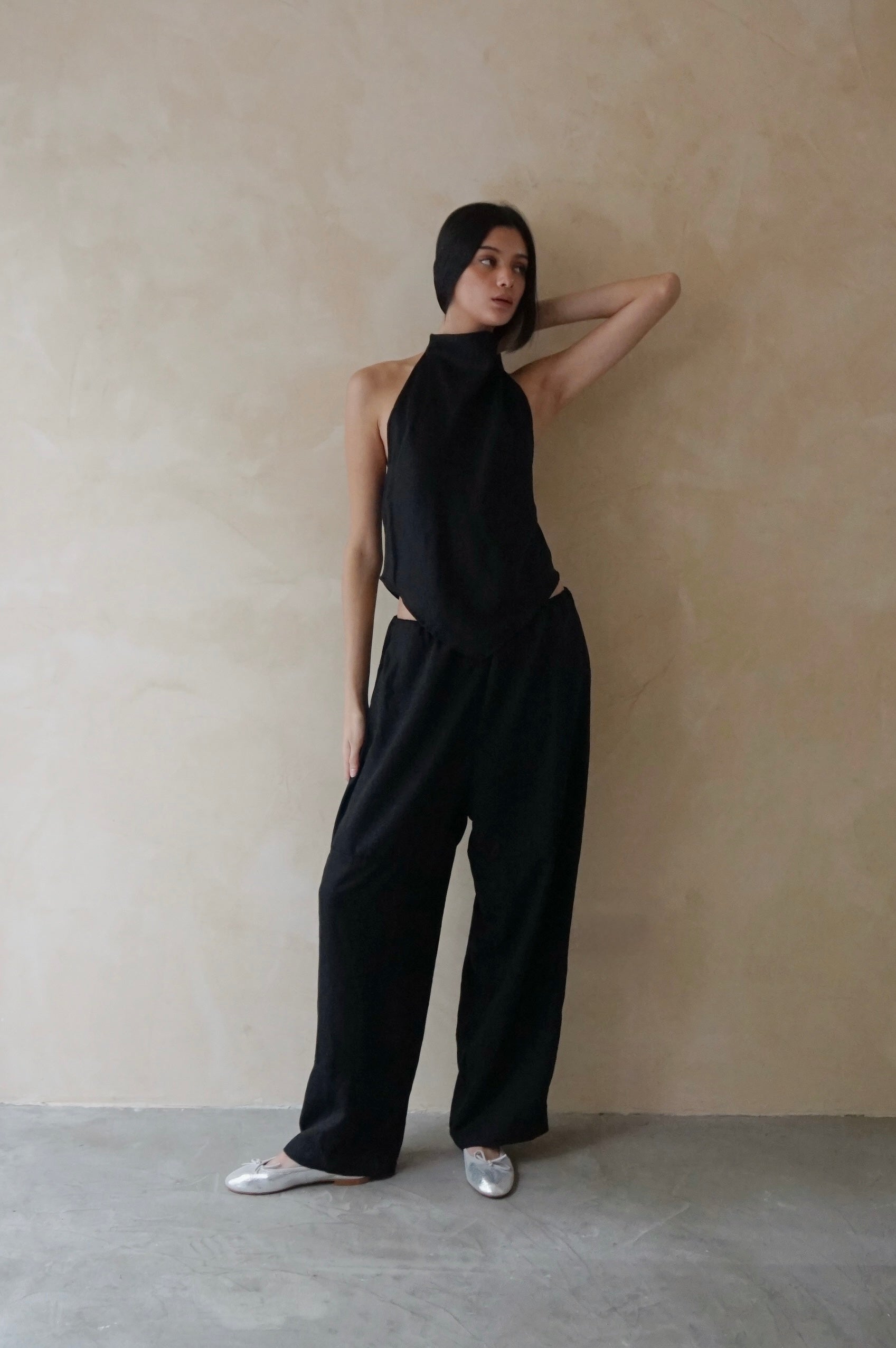 Halter neck, bias cut cowl top made from Tencel. Features high neckline with facing, two button adjustment and asymmetrical hem and back.