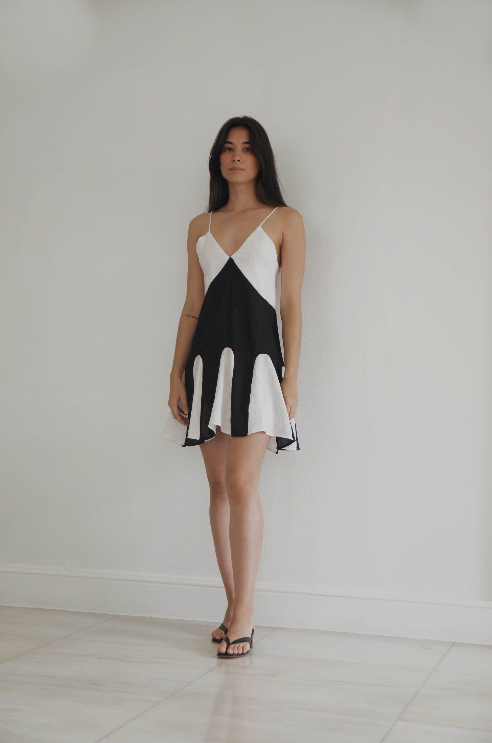Flouncy V-neck mini dress made from Pure Linen. Features cut and sew skirt panels for added volume, back zip entry and adjustable rolled string straps.