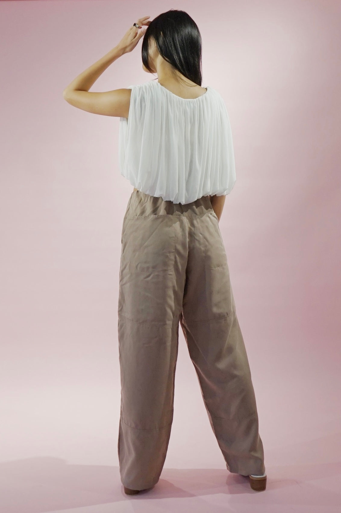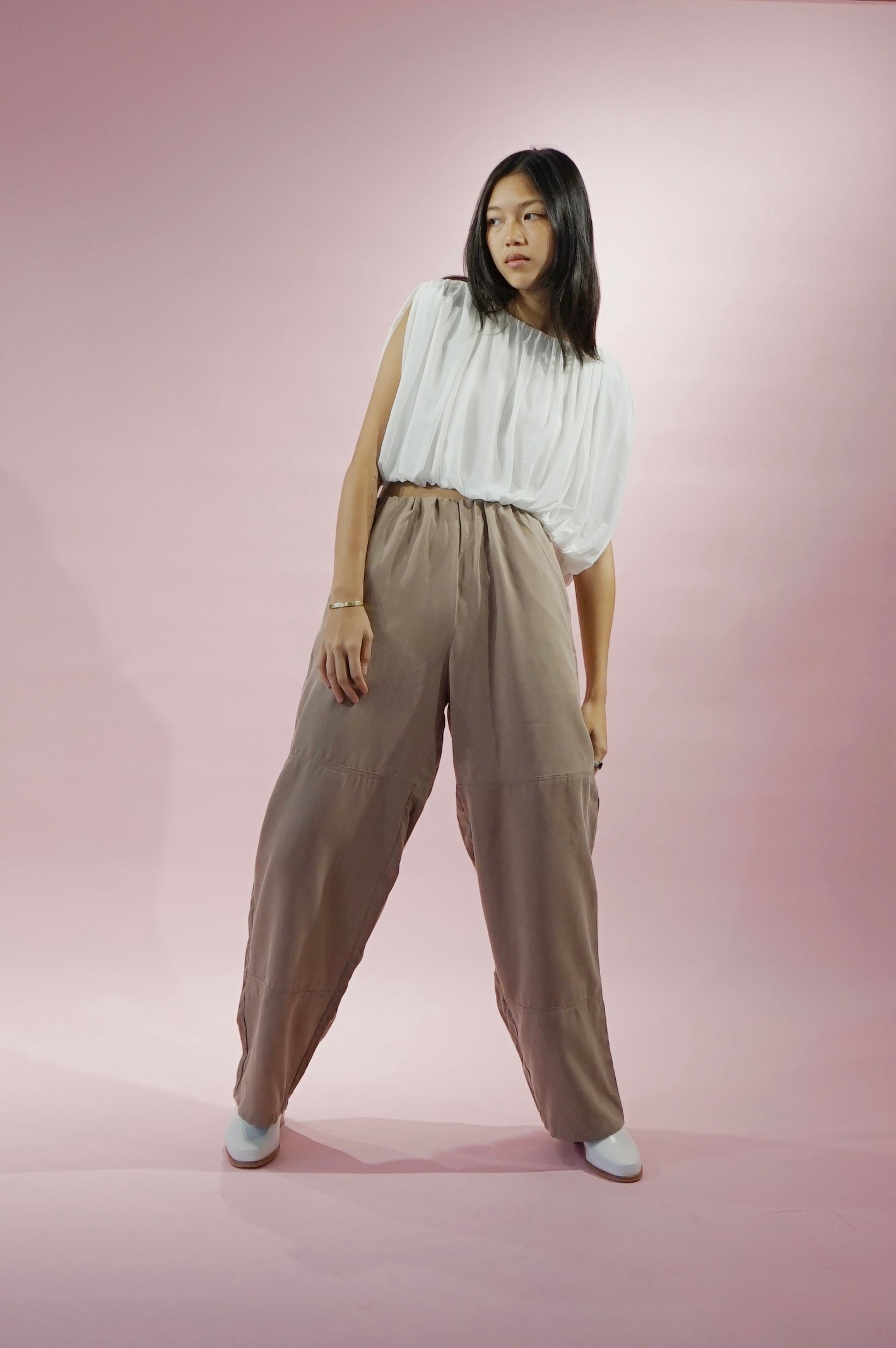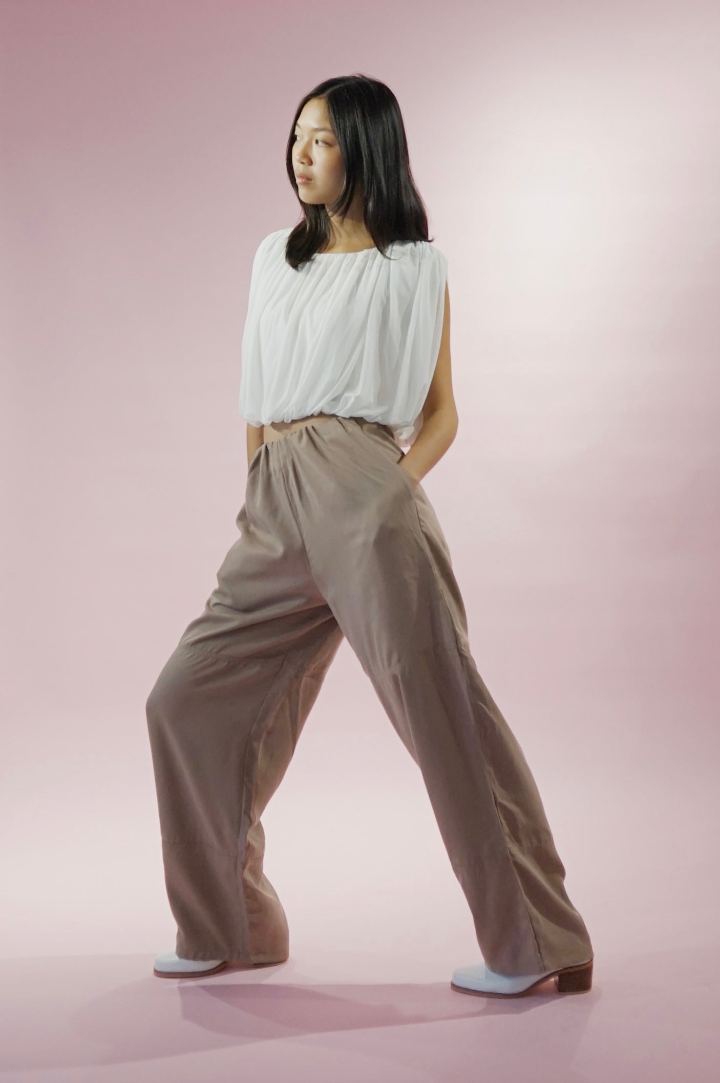 Simplified version of our panelled Flight Pants. Features seamless gartered waist band, loose wide fit with side seam front pockets, straight seam back pockets.