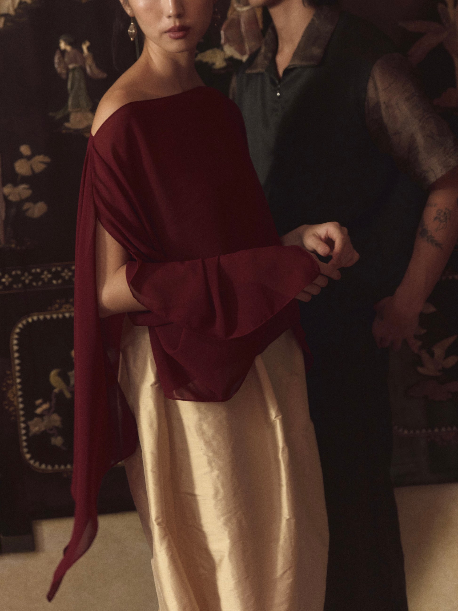 Wispy cape that can be worn numerous ways to top any ensemble made from sheer floaty chiffon. One size. Comes with chiffon pouch.