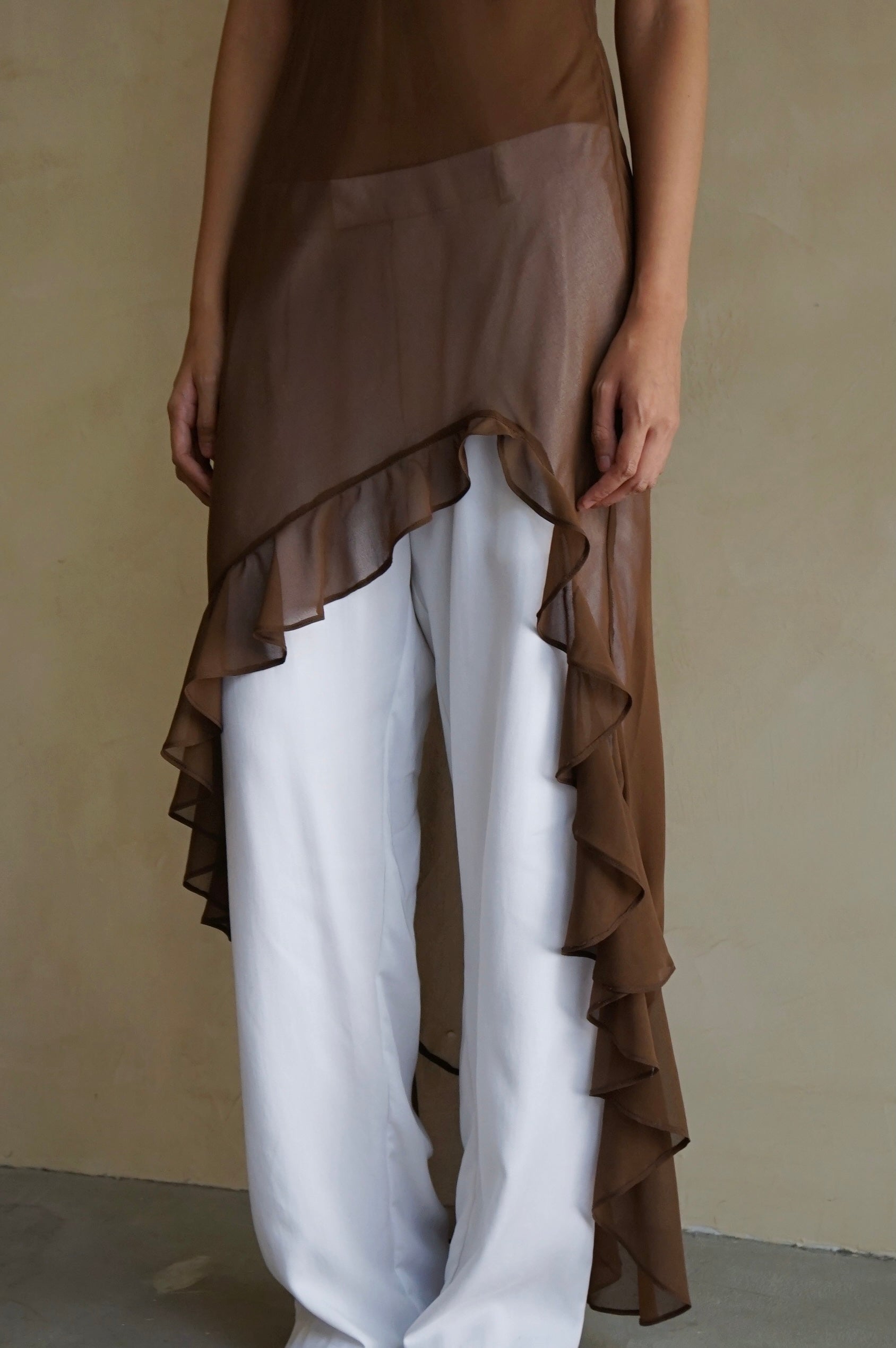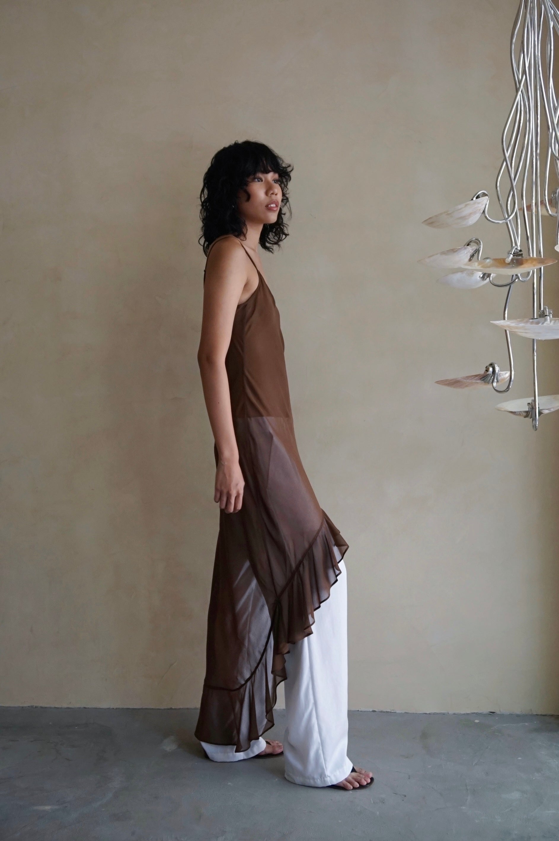 The Murina Slip Dress features an asymmetrical and ruffled hem skirt for a fun and flirty silhouette. Cut on the bias and crafted from sheer chiffon and bias cut for fluid movement. Designed to be layered.