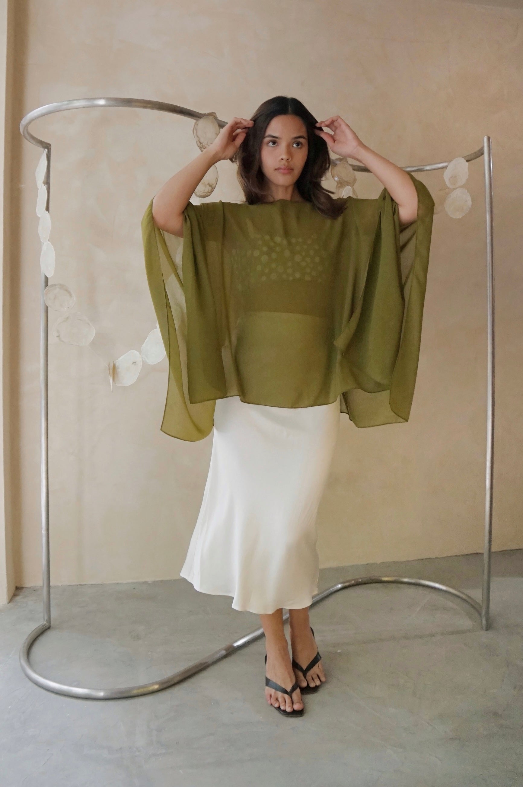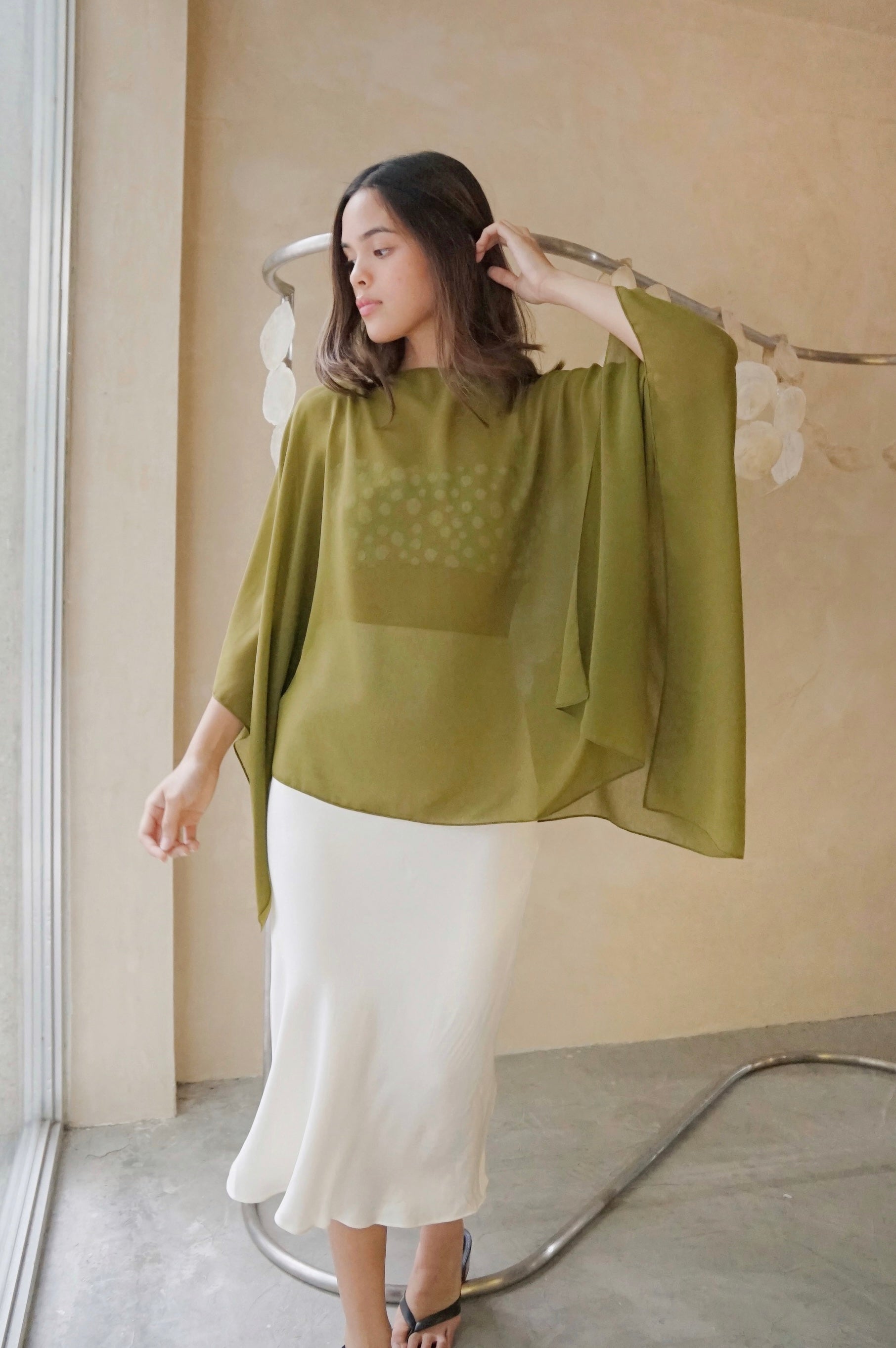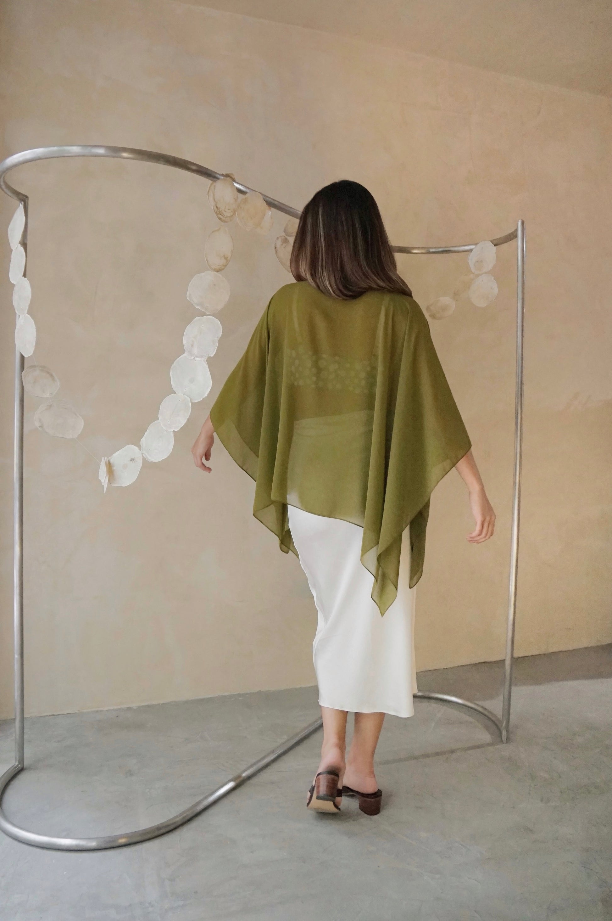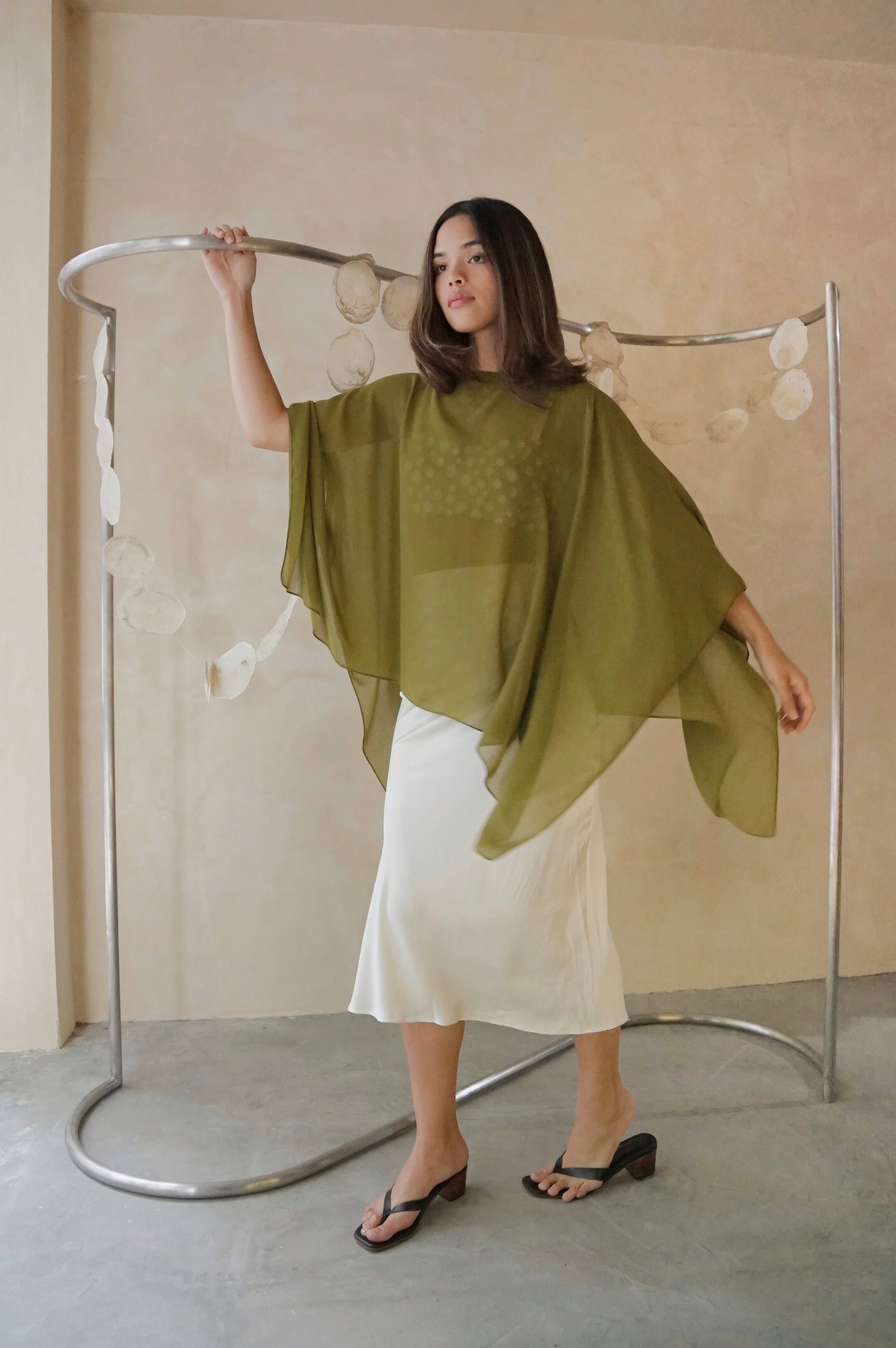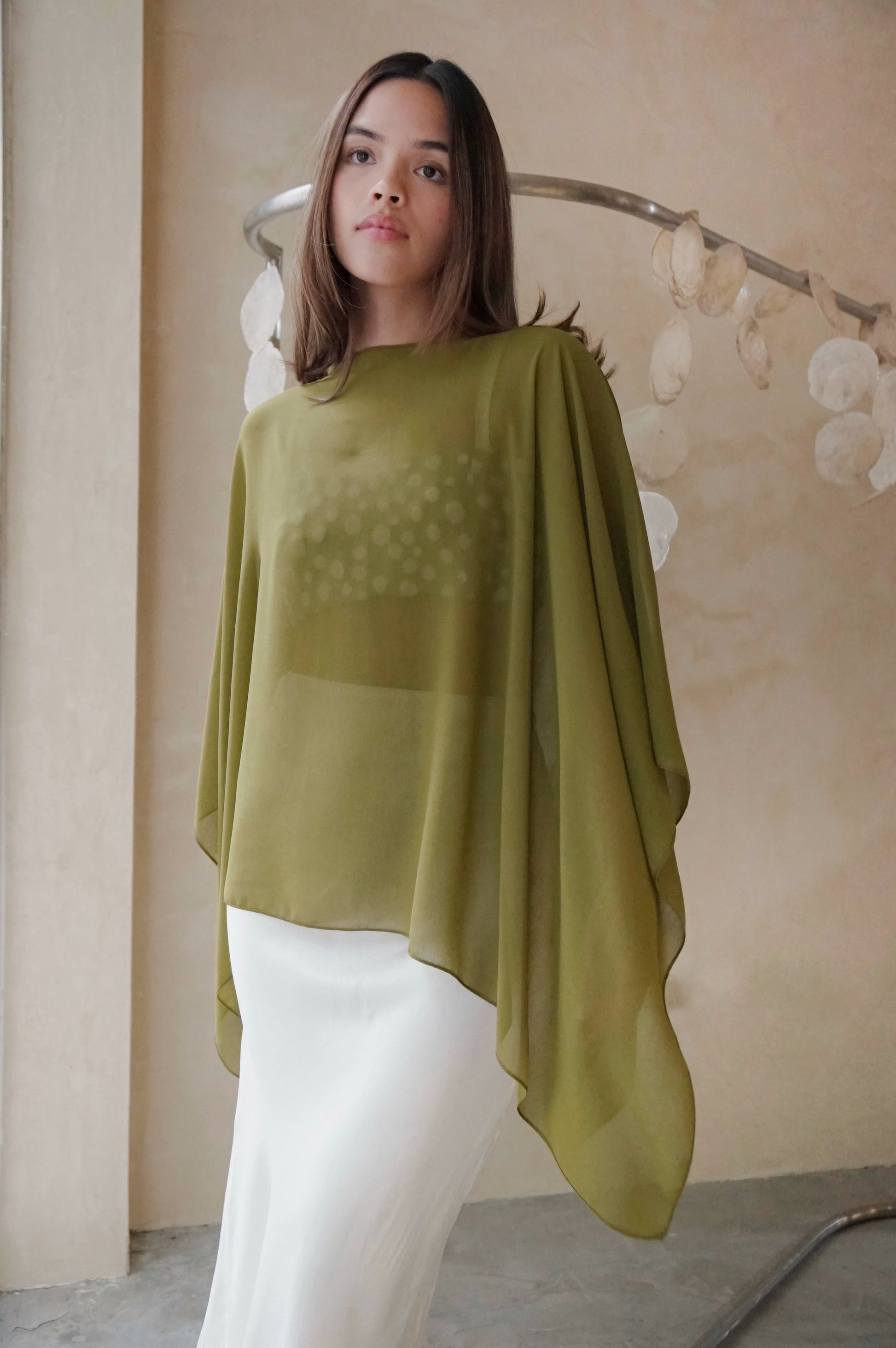 Wispy cape to top any ensemble made from sheer floaty chiffon. One size.