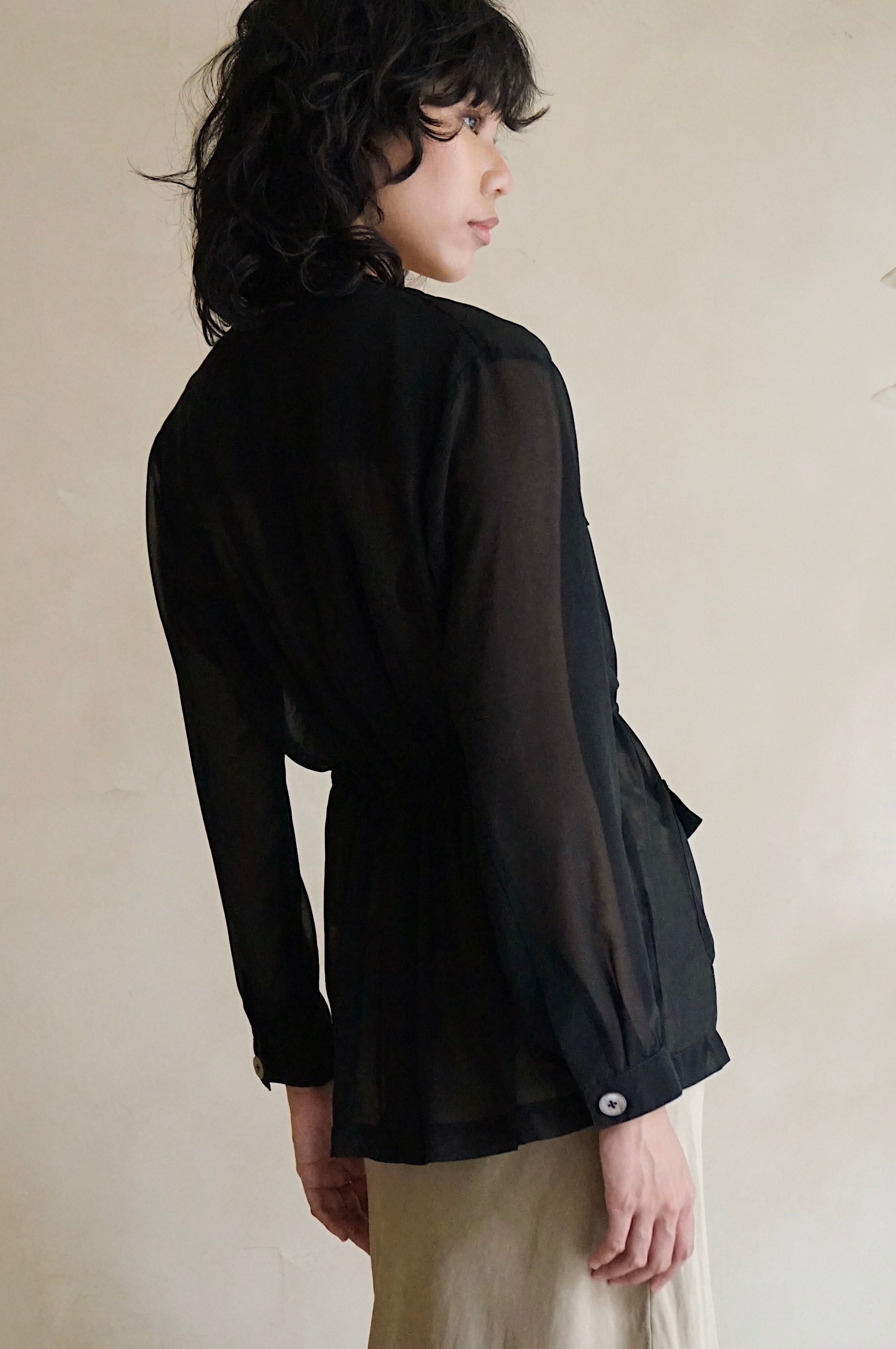 Collarless safari style jacket with four flap-pockets and a drawstring at the waist for a customizable fit. Made from Chiffon.