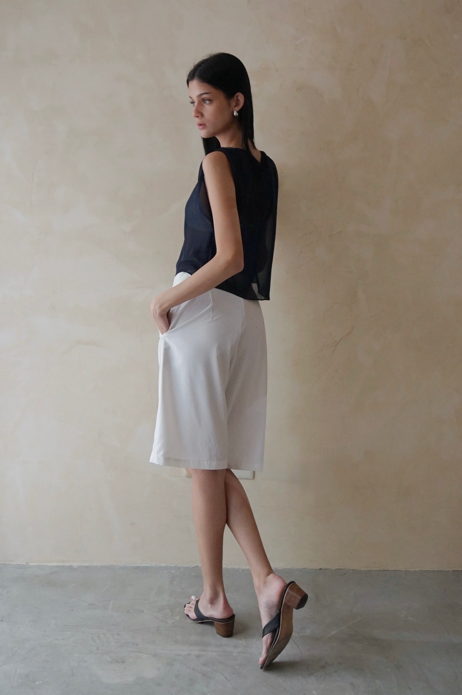 Boat neck top with shoulder pleats made from lightweight chiffon.