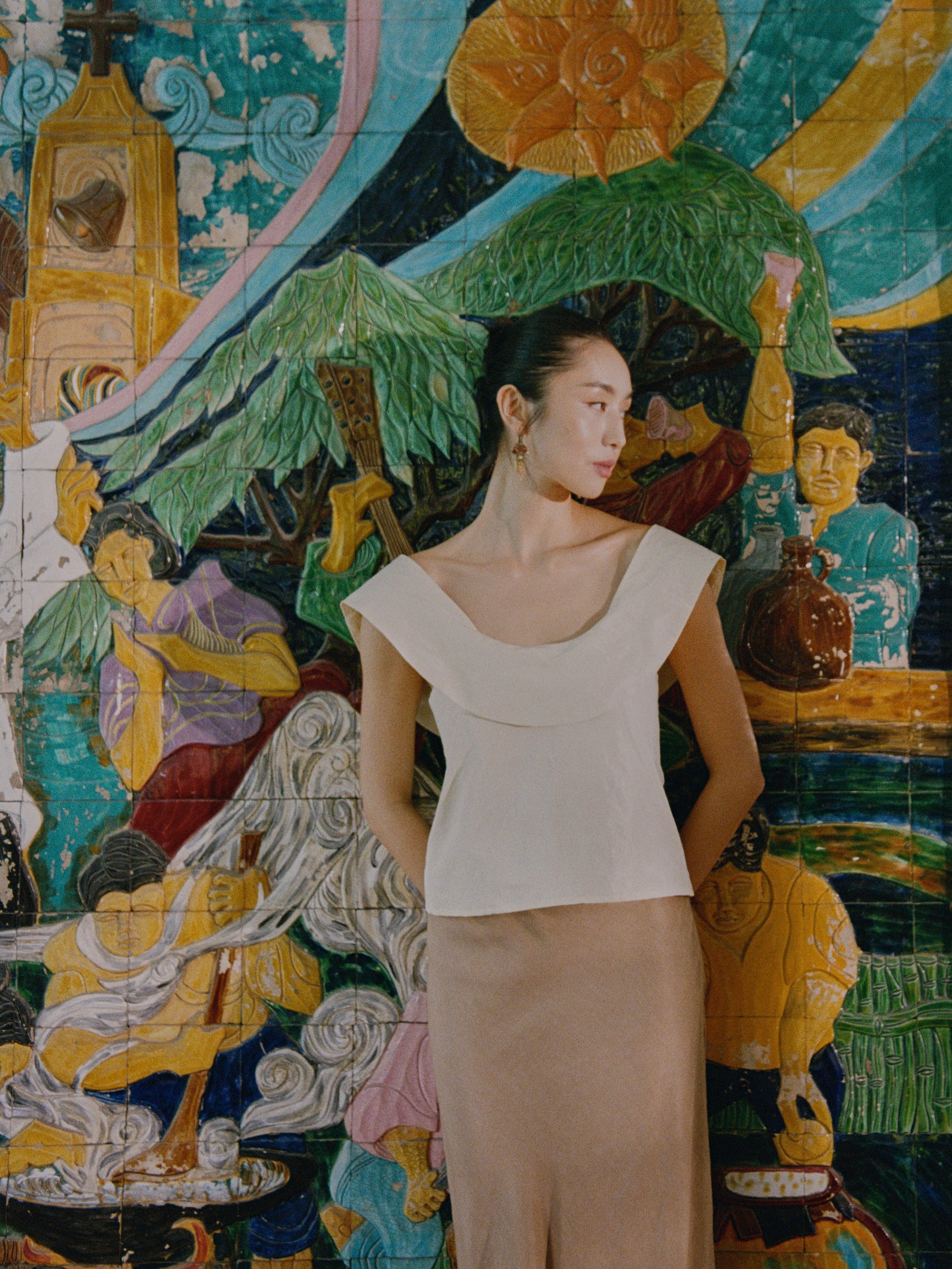 Round neck off the shoulder top with tie back made from 100% Raw Silk.