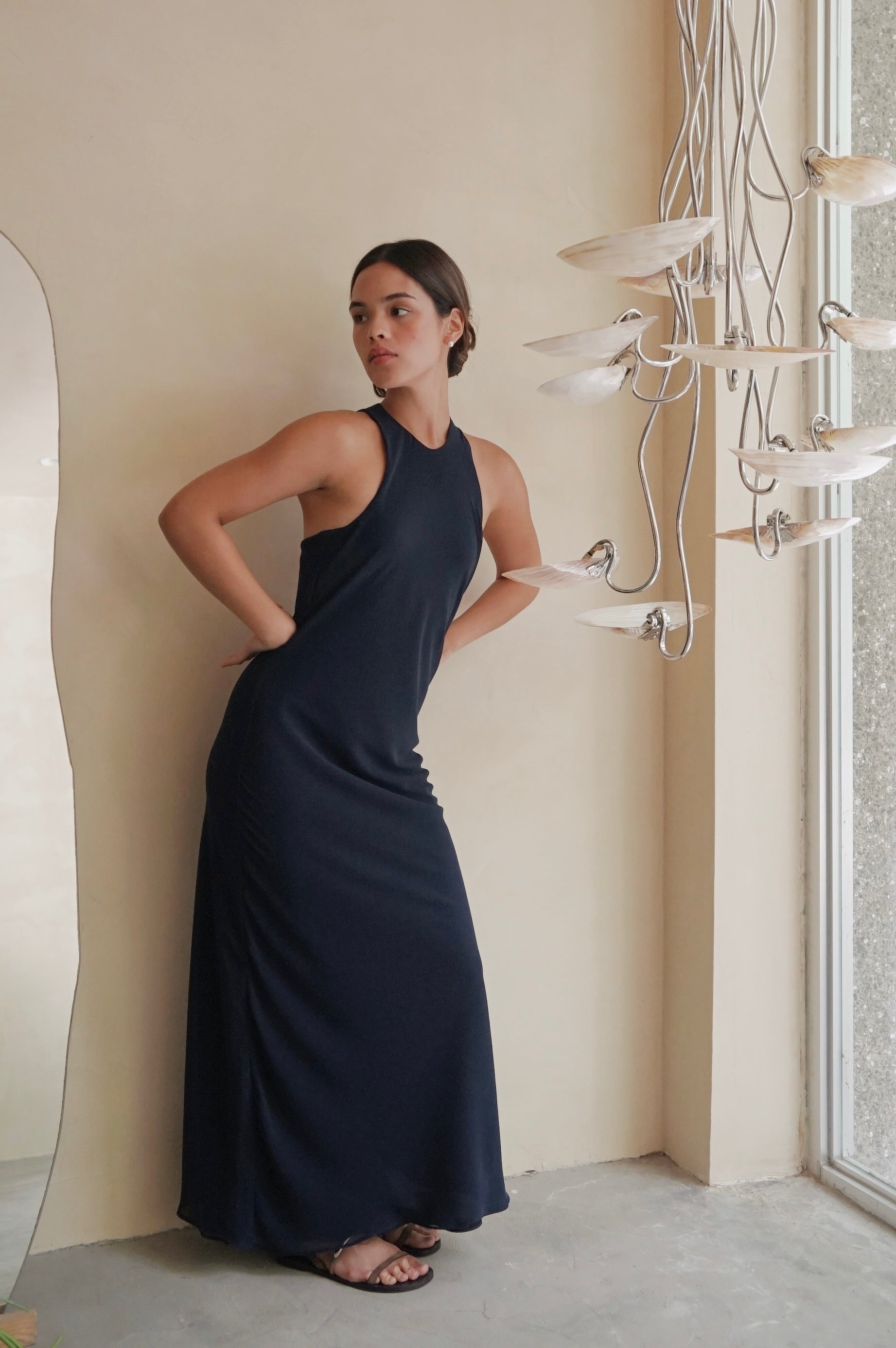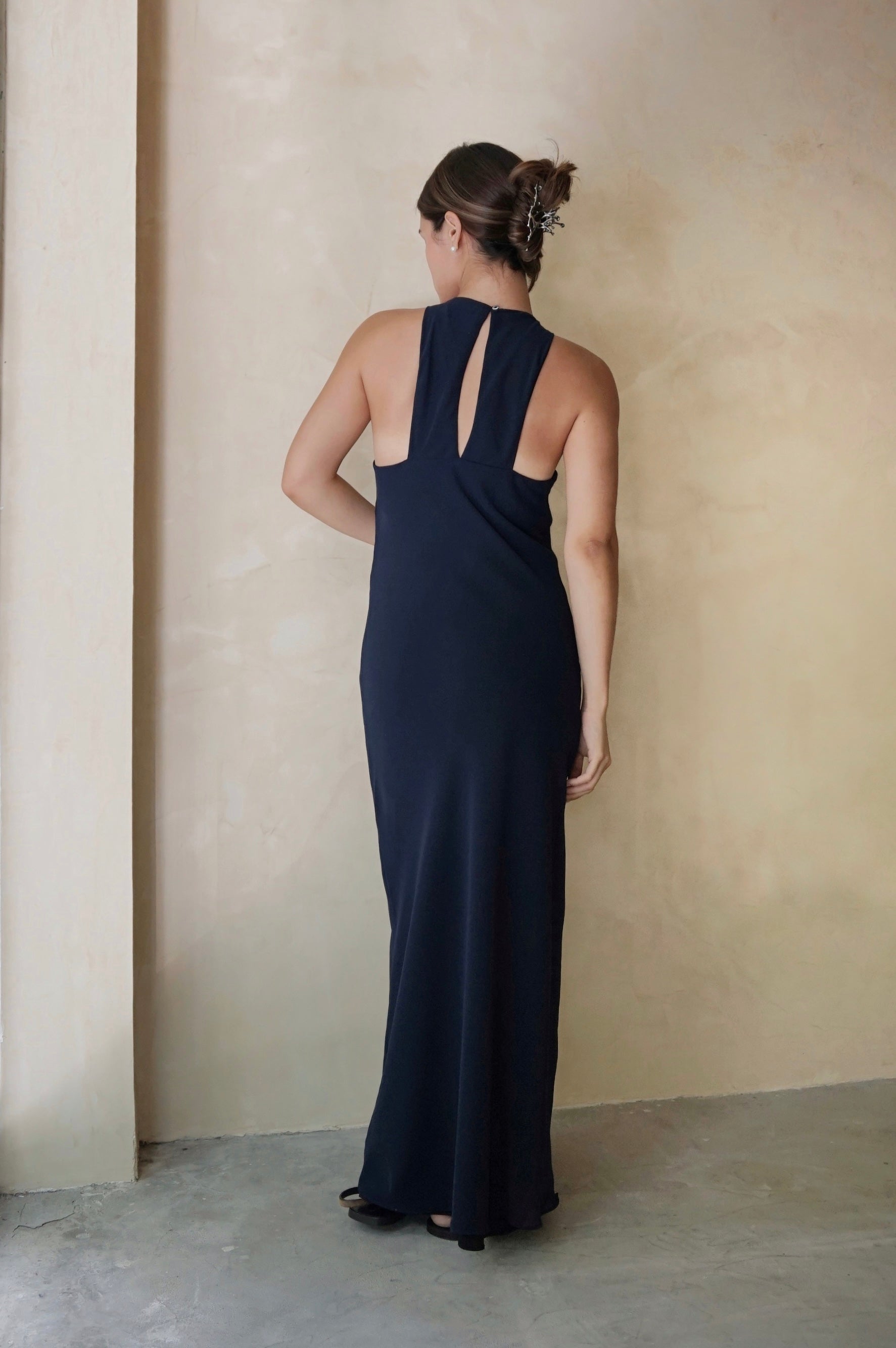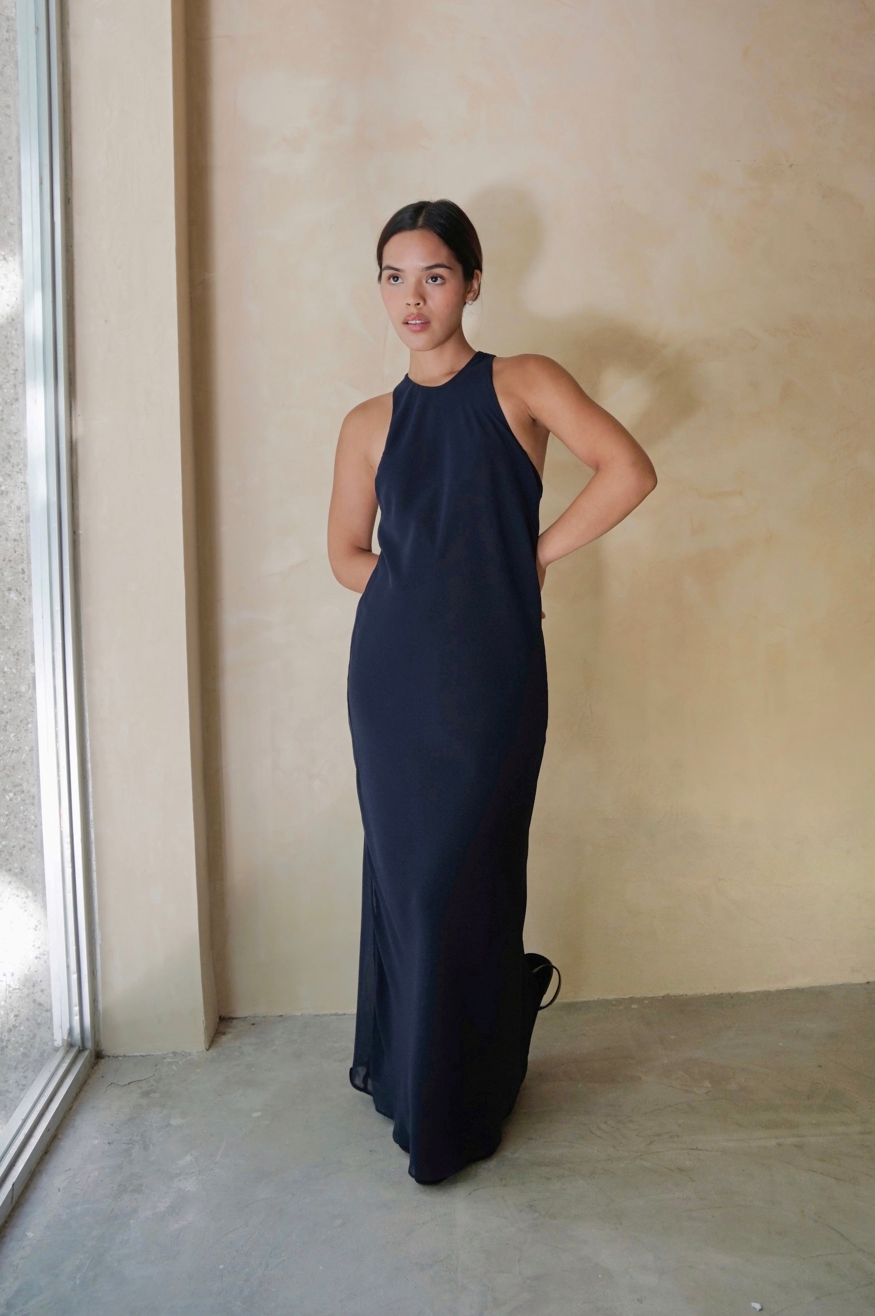 Elegant high neck maxi dress made from a silky chiffon with rayon lining. Features button opening at back, bias cut for the perfect fit.