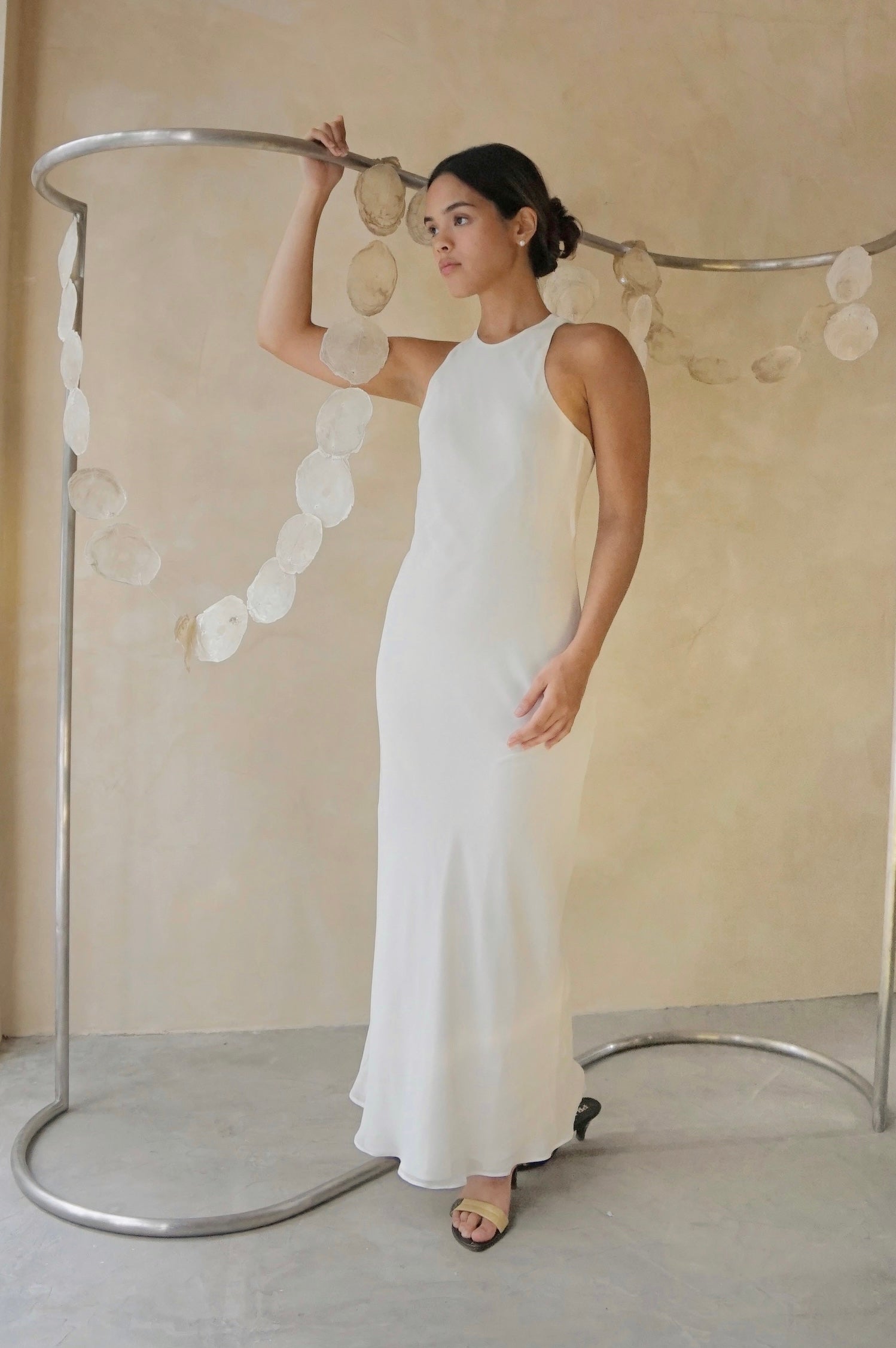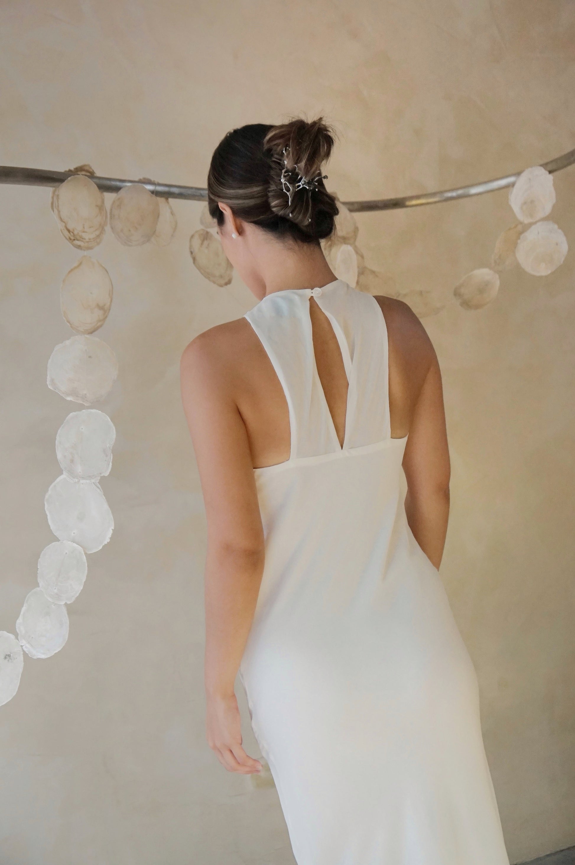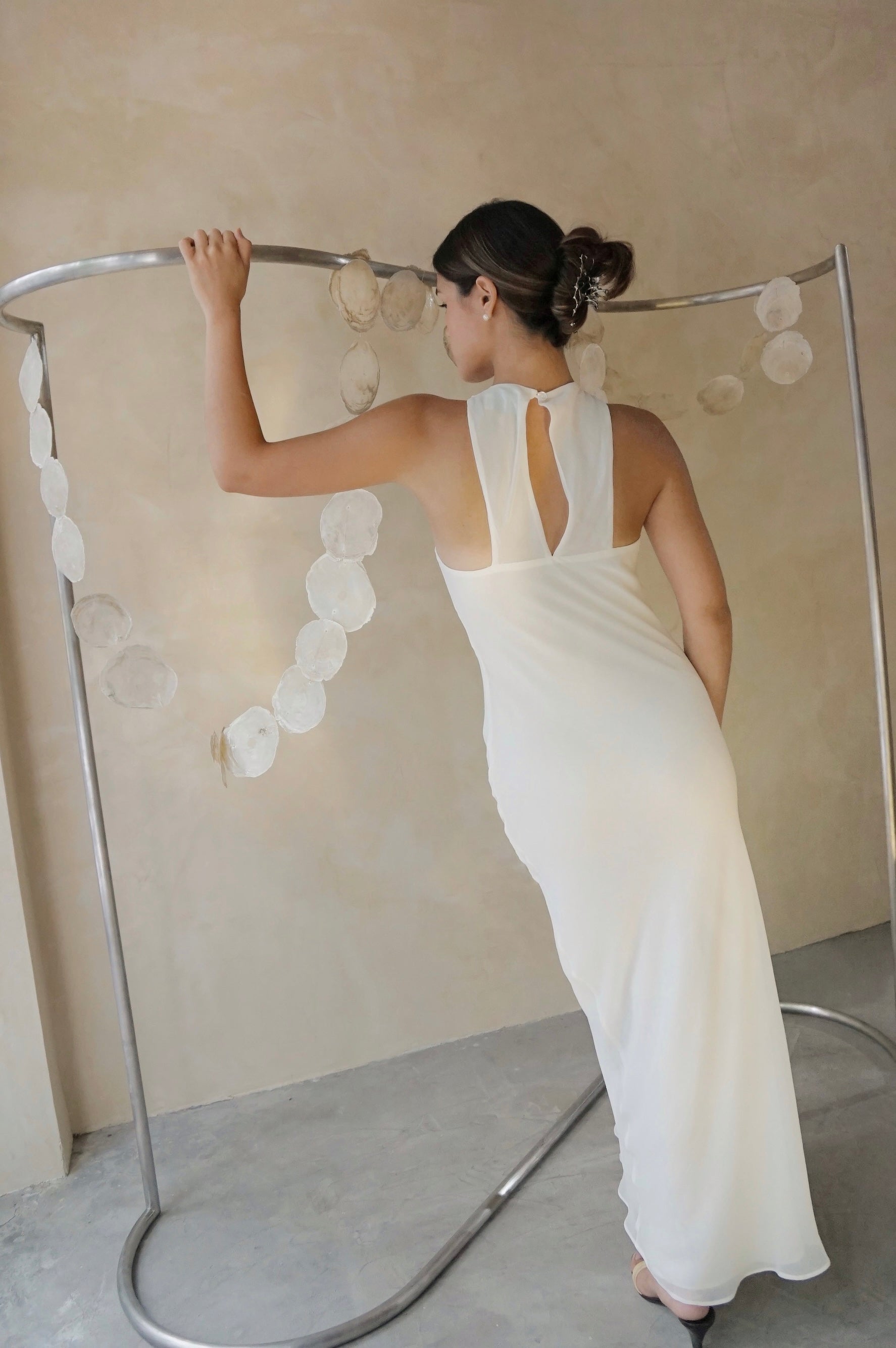 Elegant high neck maxi dress made from the wrinkle-free Chiffon. Features button opening at back and side zip for easy entry. Bias cut for the perfect fit.