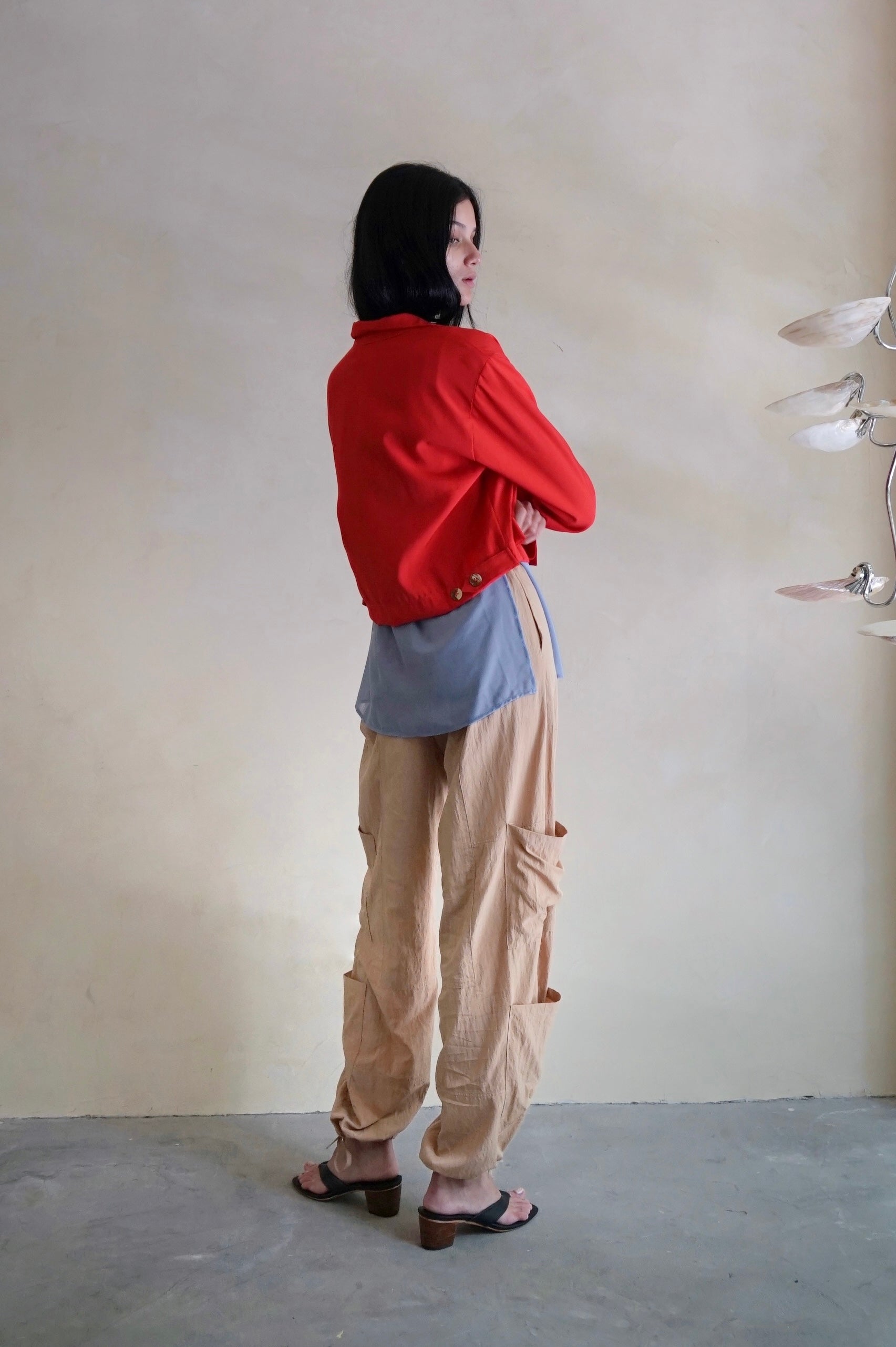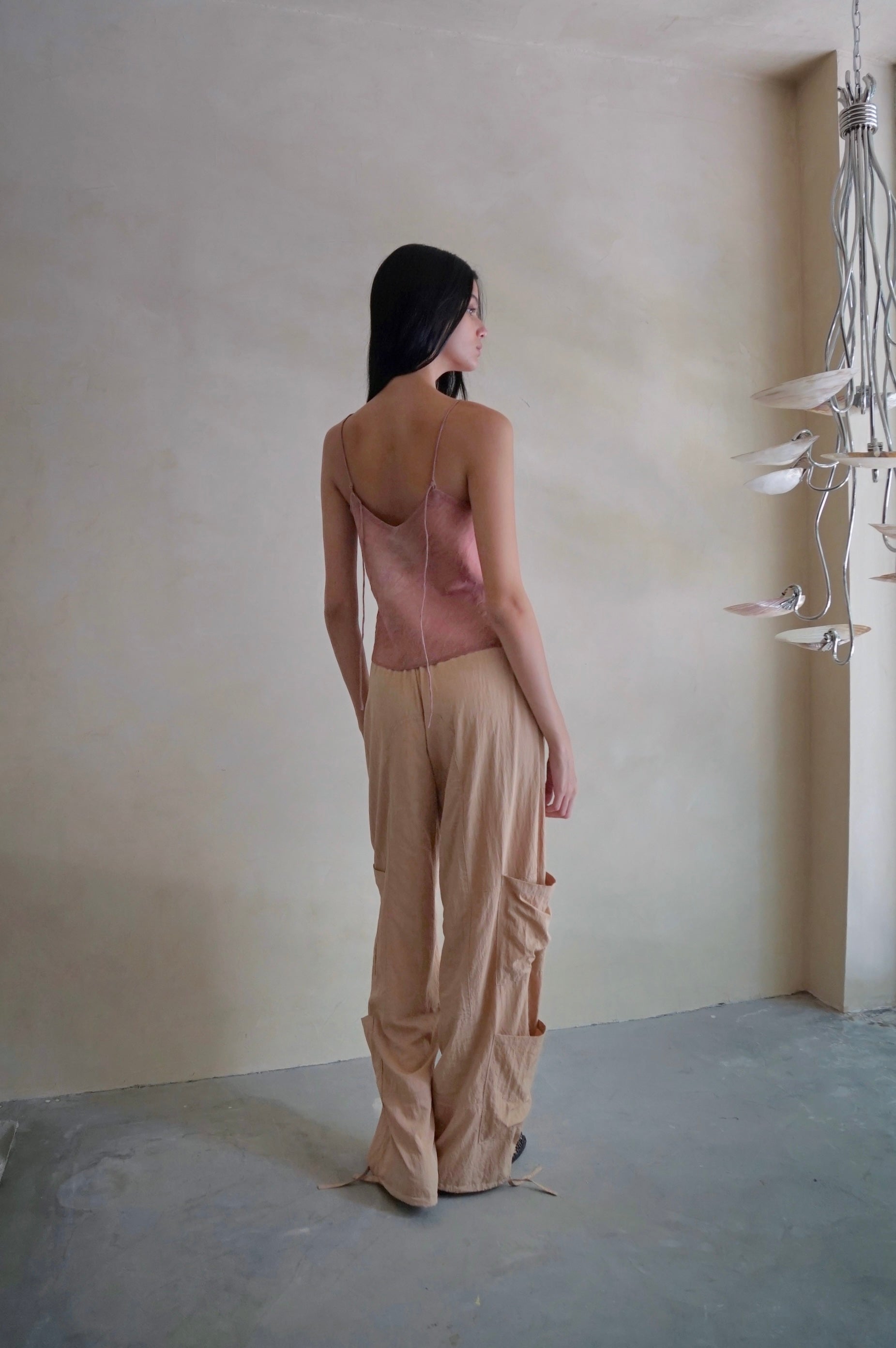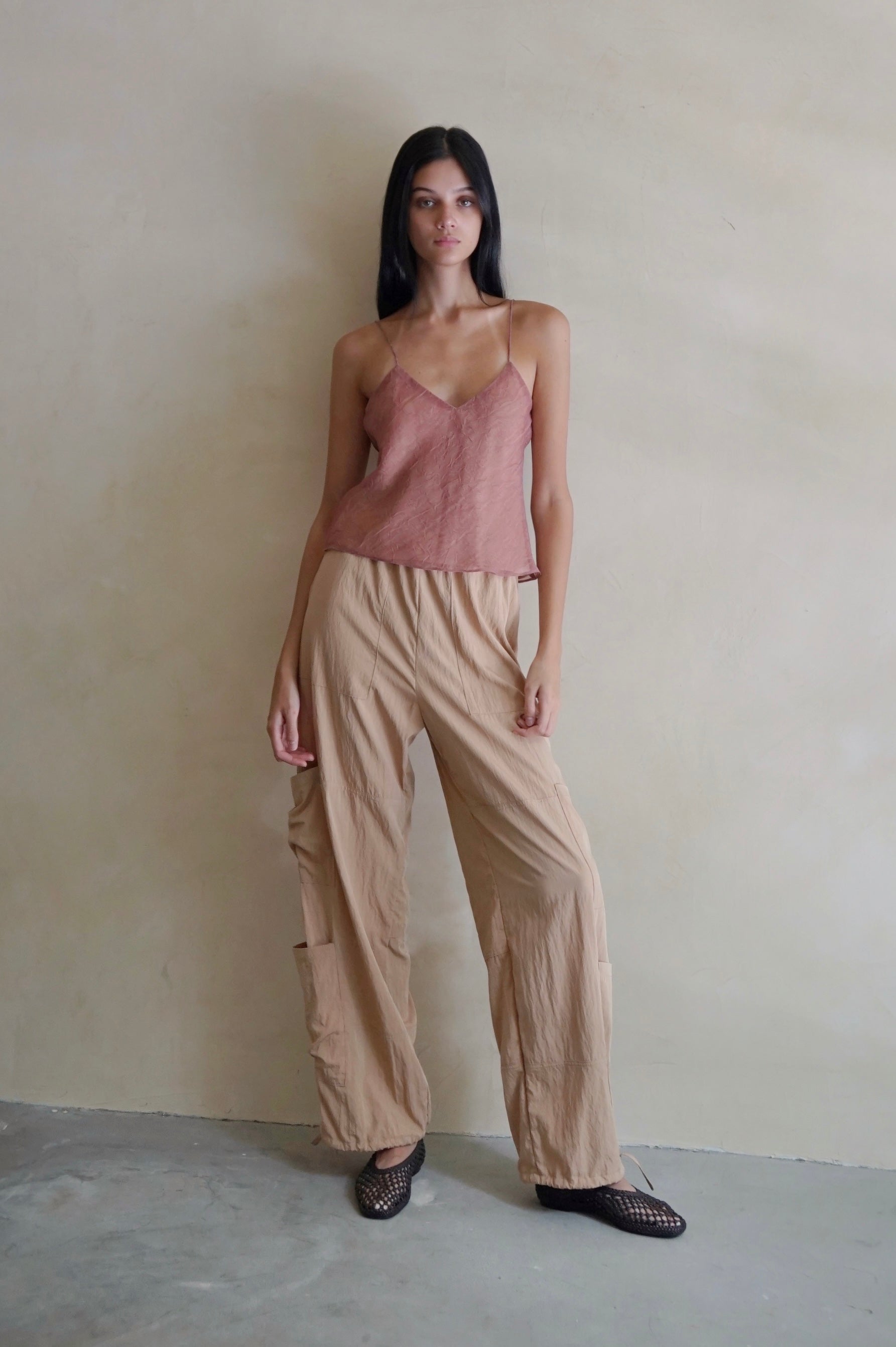 These multi-pocket pants feature a seamless gartered waistband designed to sit high or at the waist. They include 2 side seam pockets, 6 additional side pockets, a back gusset, and a drawstring hem. Crafted from lightweight Rayon Nylon for comfortable wear.