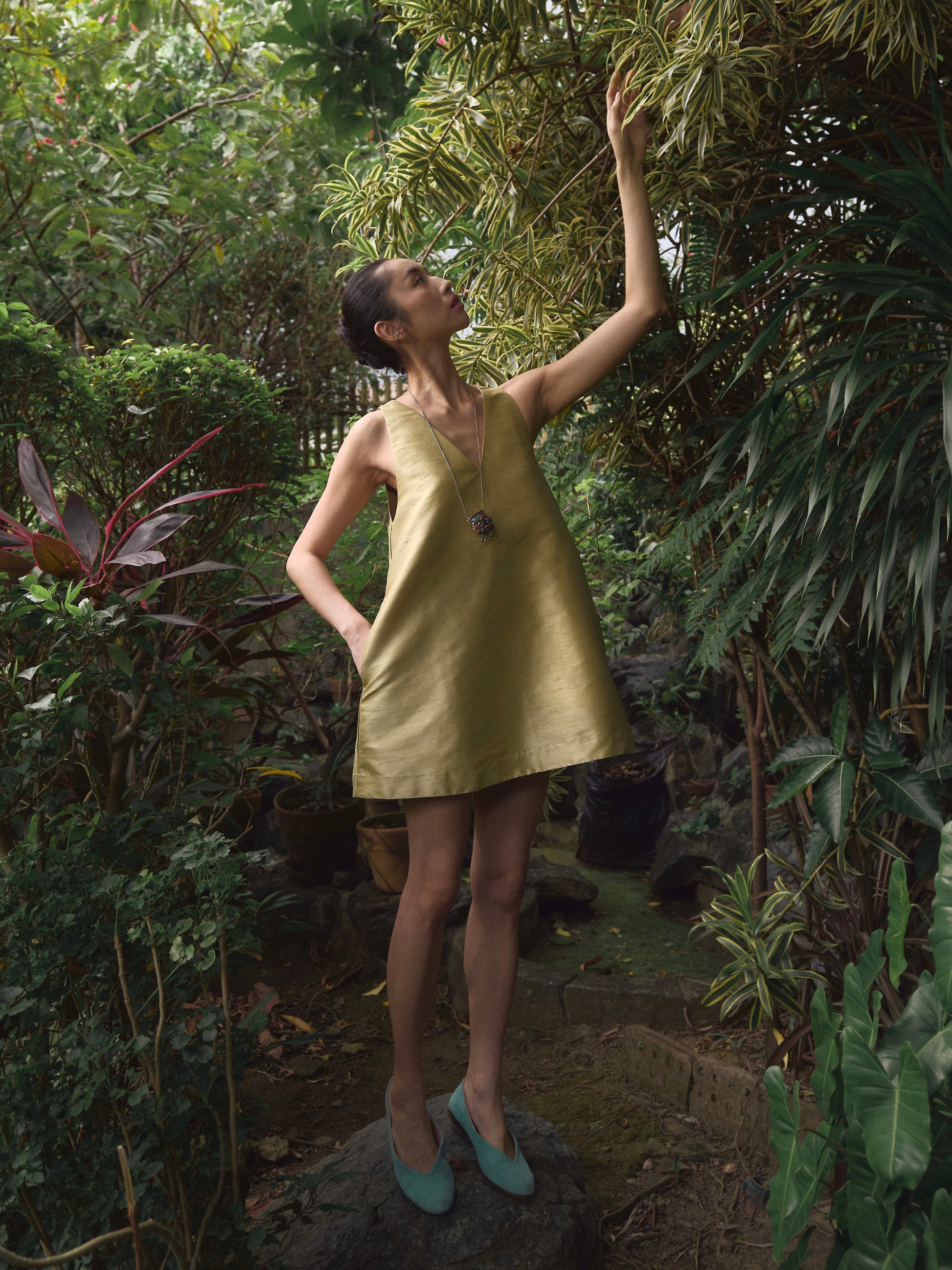 V-neck iteration of our Swing Dress made from Thai silk. Features tent style silhouette, deep V neckline, rayon lining and side seam pockets.